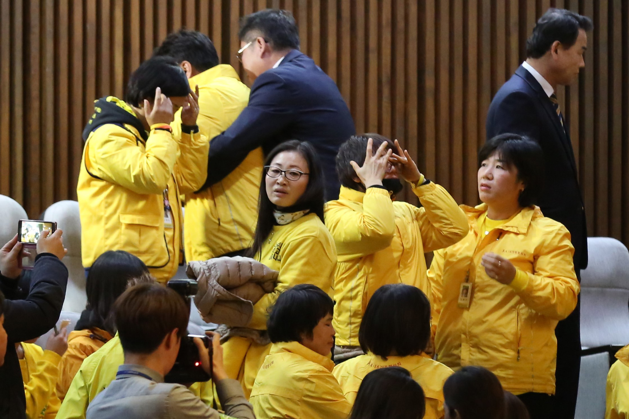 박근혜 대통령 탄핵 소추안이 가결된 9일 오후 국회 본회의장에서 세월호 유가족들이 304명 피해자들의 얼굴이 담긴 노란천을 펼치자 국회 경위들이 제지를 하고 있다.