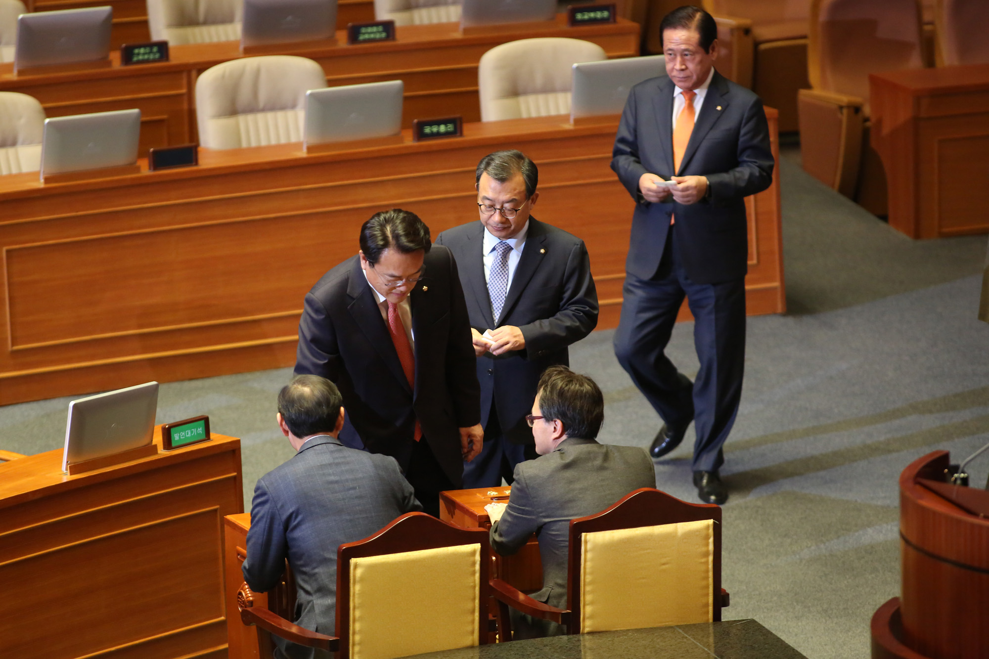 이정현 새누리당 대표와 정진석 원내대표가 9일 오후 서울 여의도 국회에서 열린 박근혜 대통령 탄핵소추안 투표에 참여하고 있다.