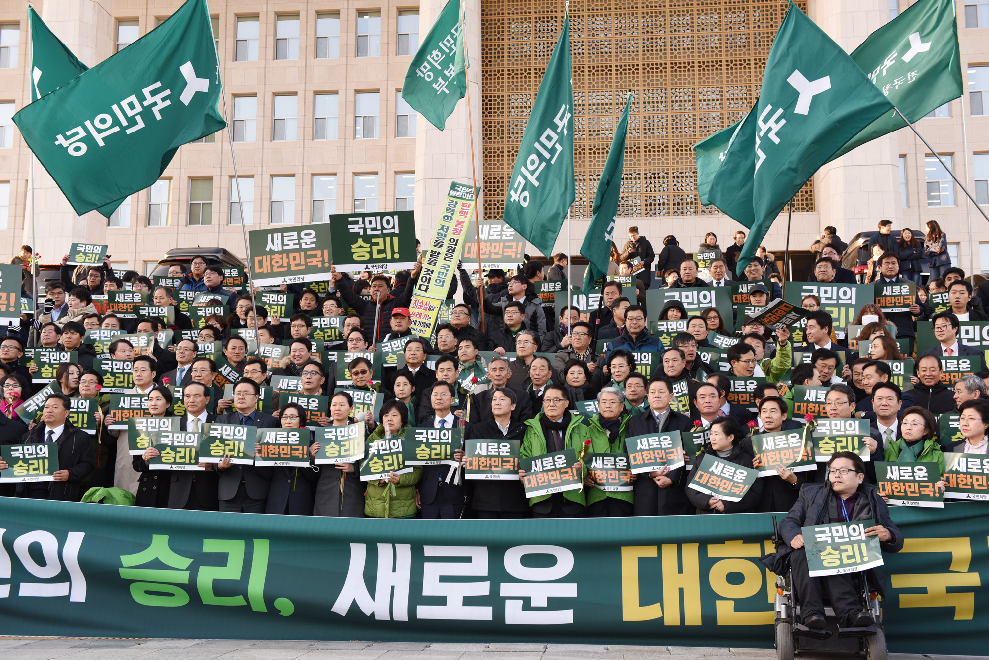 [데일리한국 이혜영 기자] 김동철 국민의당 비대위원장 및 당 지도부가 9일 오후 3시 국회에서 열린 박근혜 대통령 탄핵소추안 표결이 가결되자 본청 계단앞에 모여 입장을 표명하고 있다