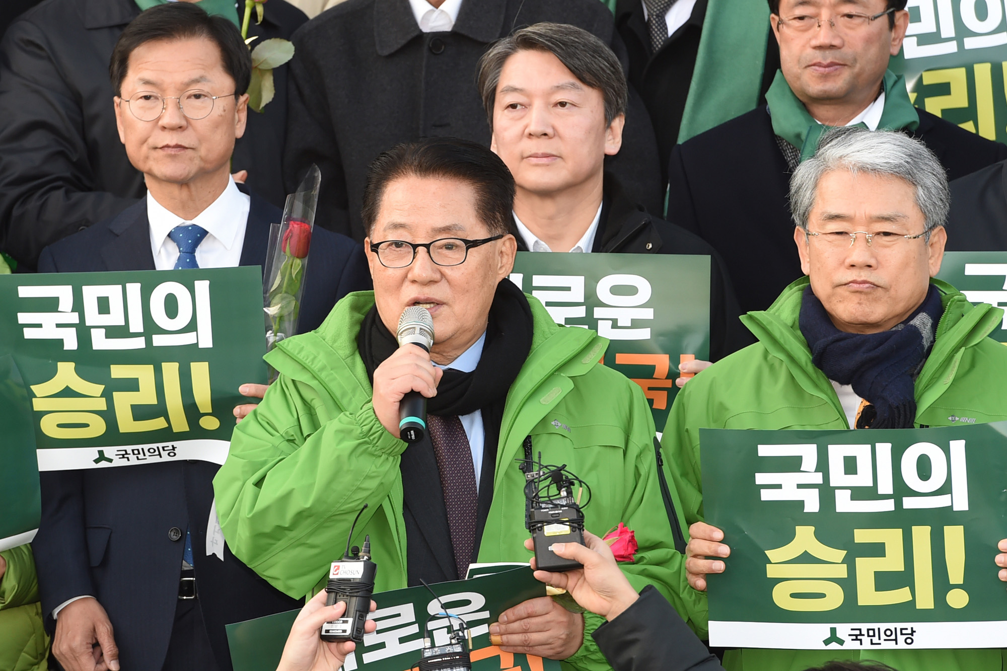[데일리한국 장동규 기자] 박지원 국민의당 원내대표 및 당 지도부가 9일 오후 3시 국회에서 열린 박근혜 대통령 탄핵소추안 표결이 가결되자 본청 계단앞에 모여 입장을 표명하고 있다.