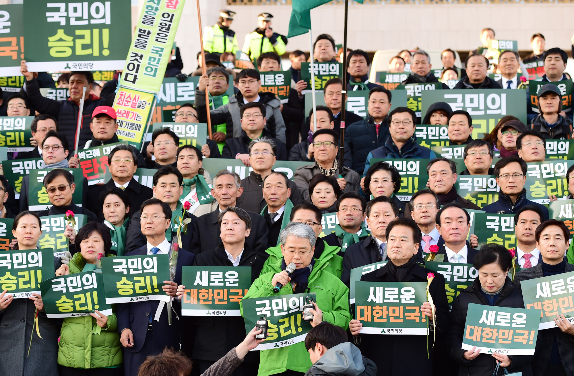 [데일리한국 이혜영 기자] 김동철 국민의당 비대위원장 및 당 지도부가 9일 오후 3시 국회에서 열린 박근혜 대통령 탄핵소추안 표결이 가결되자 본청 계단앞에 모여 입장을 표명하고 있다