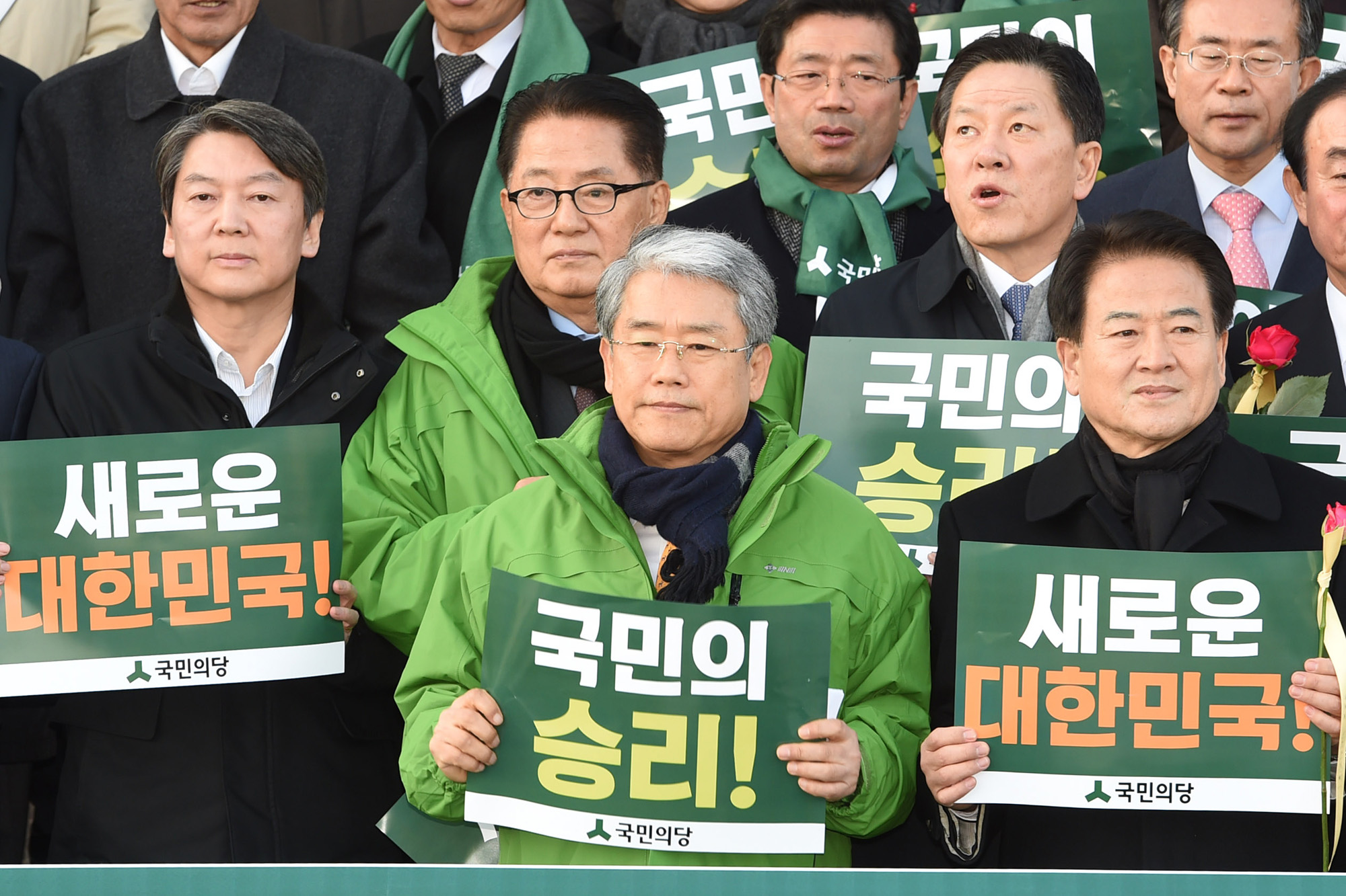 [데일리한국 이혜영 기자] 김동철 국민의당 비대위원장 및 당 지도부가 9일 오후 3시 국회에서 열린 박근혜 대통령 탄핵소추안 표결이 가결되자 본청 계단앞에 승리에 피켓을 들고 있다.