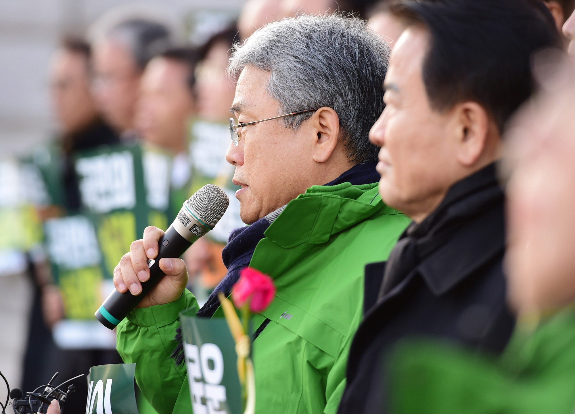 [데일리한국 이혜영 기자] 김동철 국민의당 비대위원장 및 당 지도부가 9일 오후 3시 국회에서 열린 박근혜 대통령 탄핵소추안 표결이 가결되자 본청 계단앞에 모여 입장을 표명하고 있다