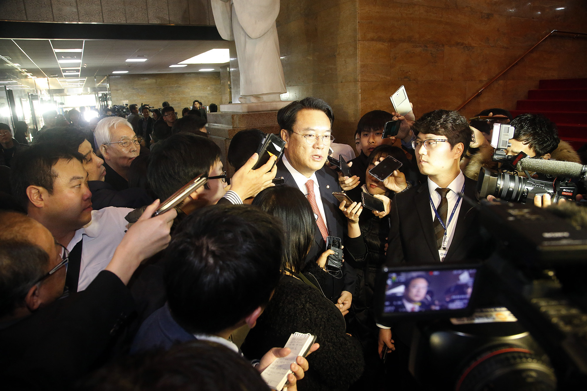 9일 오후 국회에서 박근혜 대통령 탄핵소추안 표결을 마친 정진석 새누리당 원내대표가 국회 본청을 빠져나가다 기자들에게 심경을 밝히고 있다.