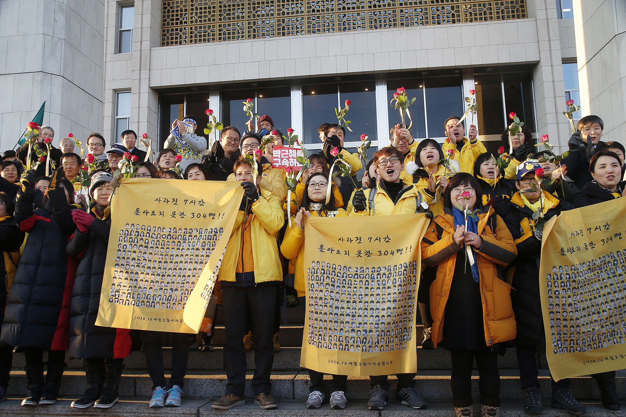 9일 오후 국회에서 박근혜 대통령 탄핵소추안 표결이 끝나자 방청했던 세월호 유족들이 좋아하고, 눈물흘리며 국회를 나서고 있다.