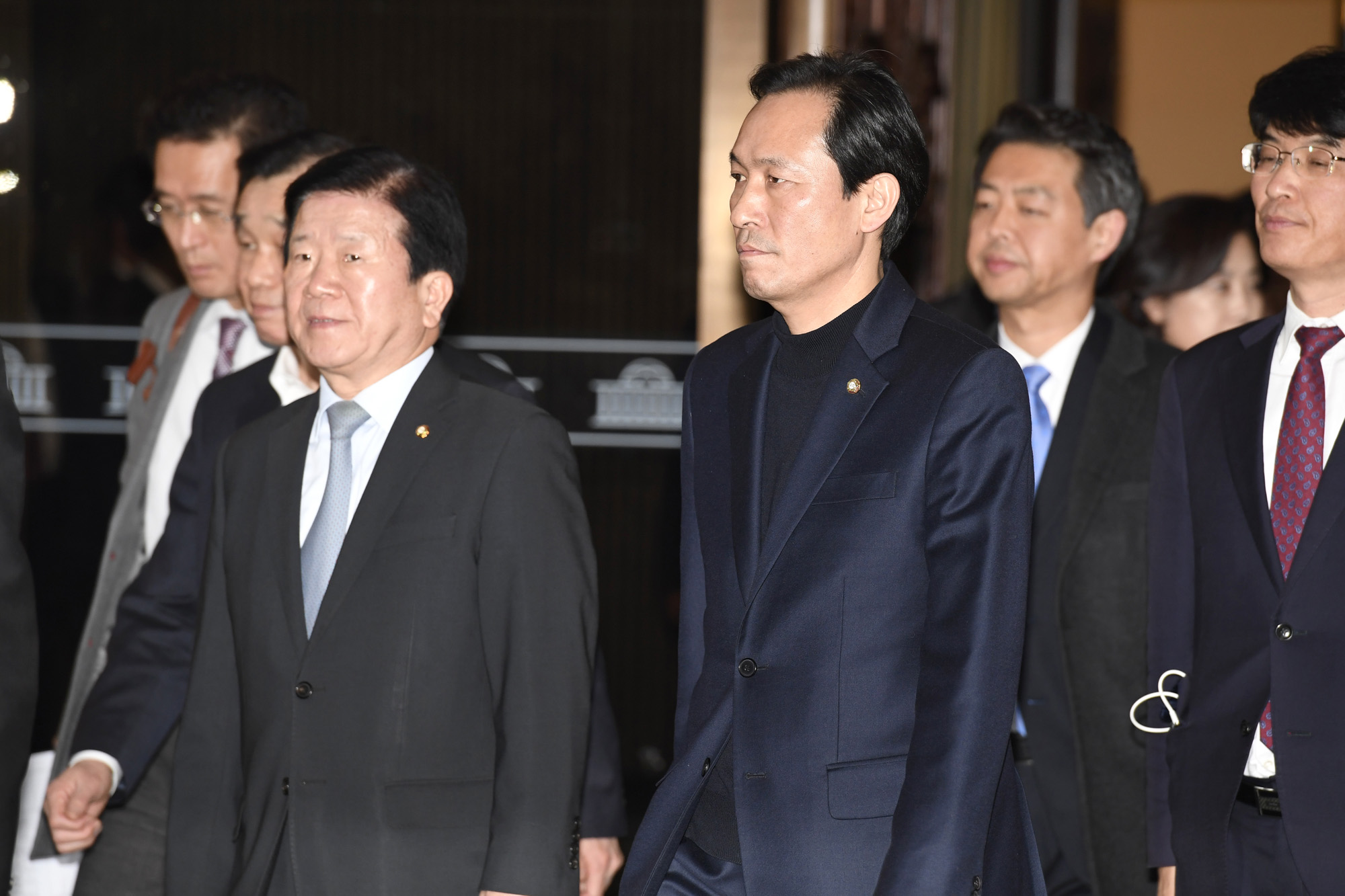 더불어민주당 우상호 원내대표와 의원들이 9일 오후 서울 여의도 국회에 본회의장에서 열린 박근혜 대통령 탄핵소추안 표결 후 탄핵이 가결된 뒤 본회의장을 빠져나오고 있다.