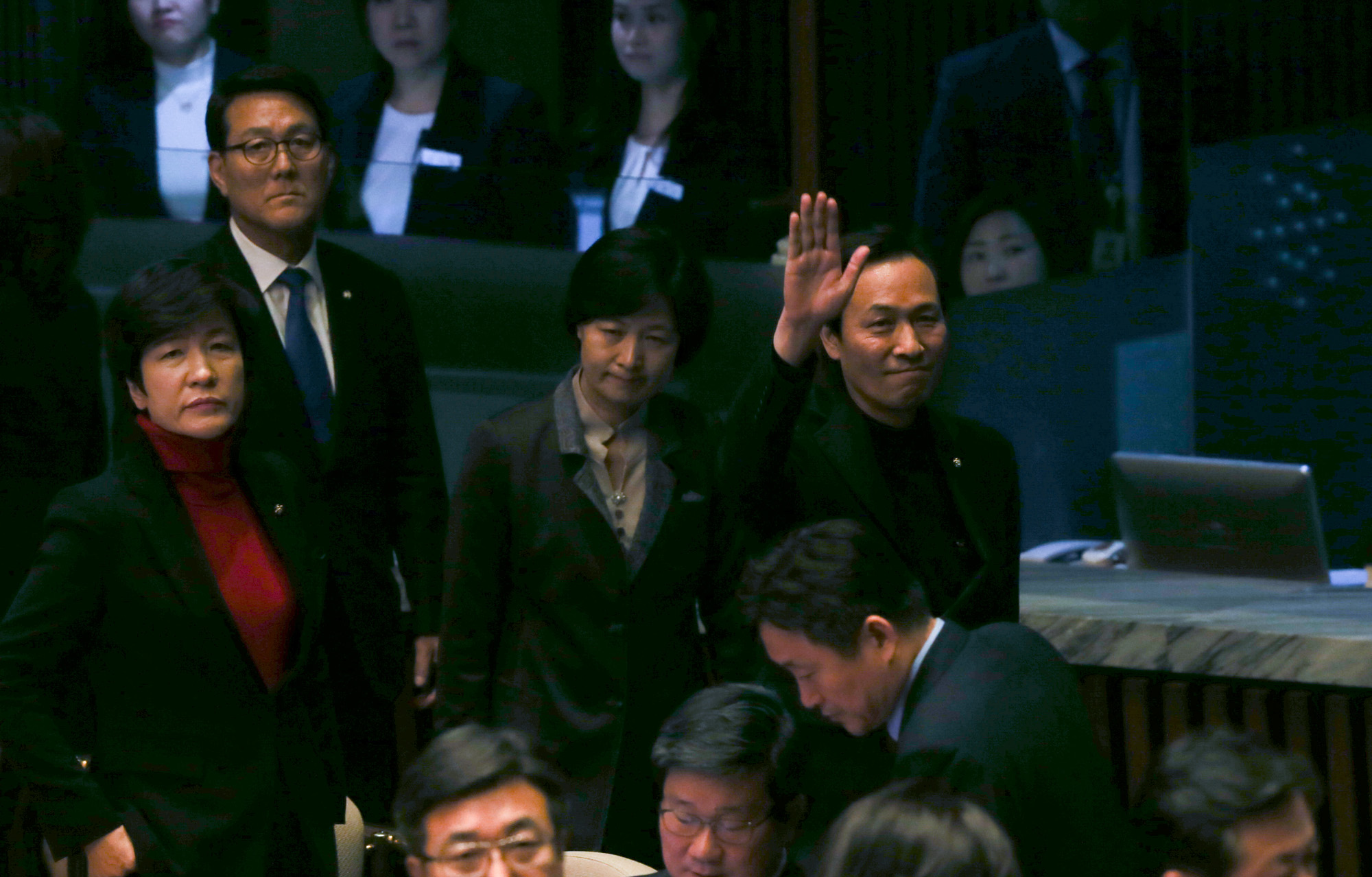 우상호 더불어민주당 원내대표가 9일 서울 여의도 국회에서 열린 본회의에서 박근혜 대통령 탄핵안이 가결되자 방청석에 세월호 유가족들에게 손을 흔들고 있다. 오른쪽 두번째 추미애 대표. 2016.12.9/뉴스1