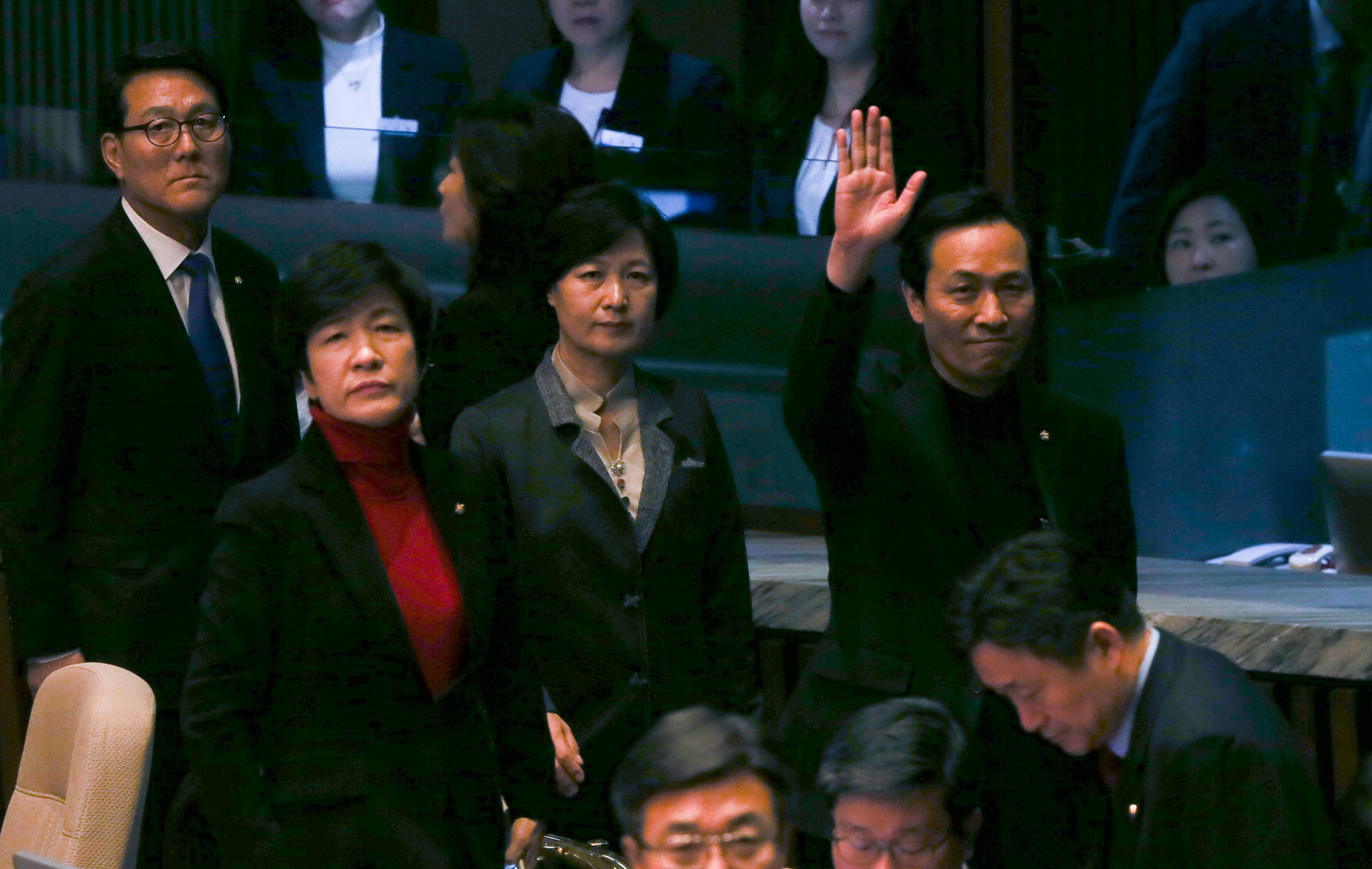 우상호 더불어민주당 원내대표가 9일 서울 여의도 국회에서 열린 본회의에서 박근혜 대통령 탄핵안이 가결되자 방청석에 세월호 유가족들에게 손을 흔들고 있다. 오른쪽 두번째 추미애 대표. 2016.12.9/뉴스1