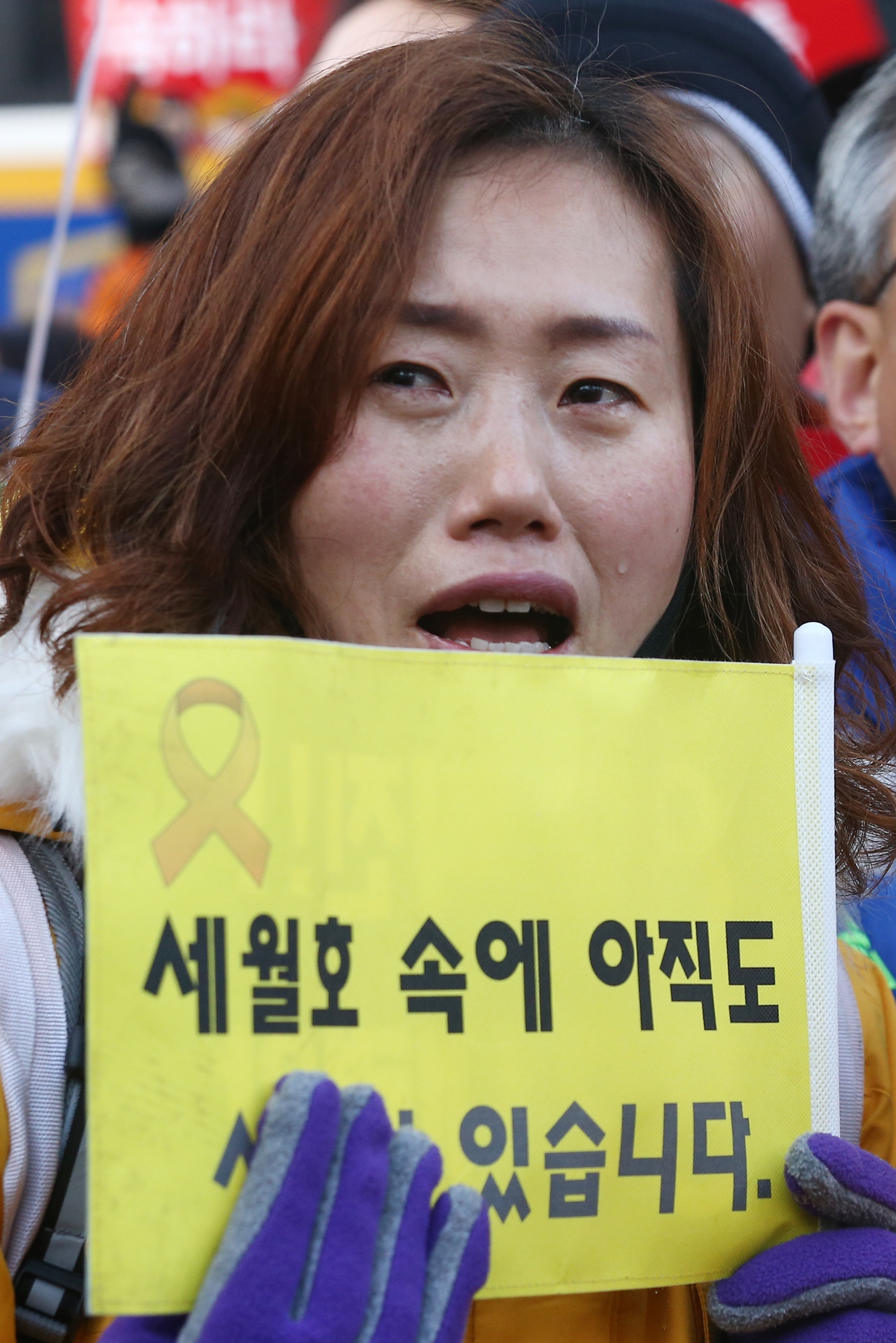 박근혜 대통령의 탄핵안 가결 후 첫 촛불집회가 열리는 10일 오후 서울 세종로 광화문광장에서 종로구 자하문로 청와대 100m 앞까지 행진에 나선 세월호 유가족이 눈물을 흘리고 있다.20161210 사진공동취재단