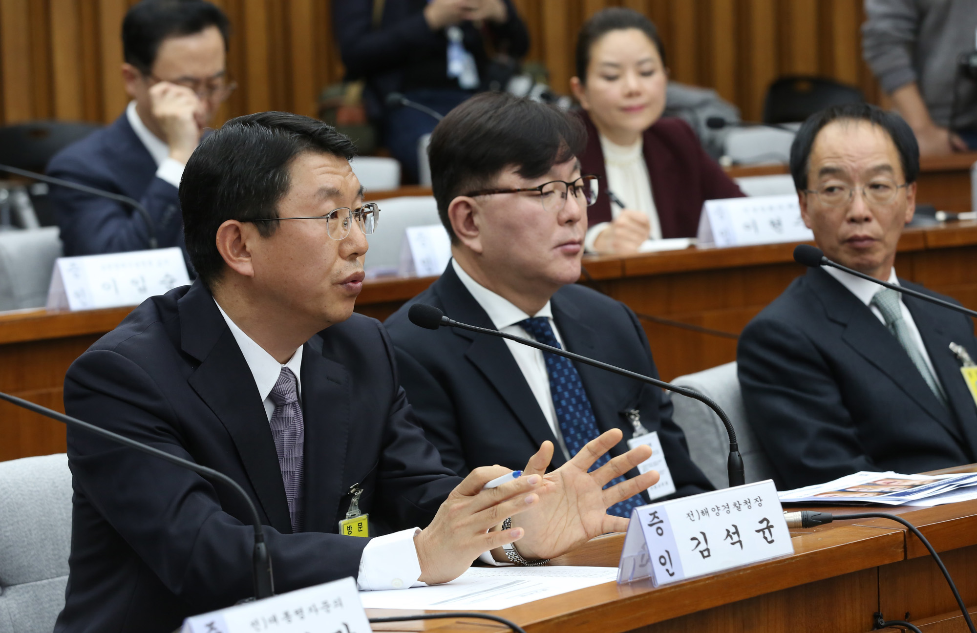 14일 국회에서 열린 '박근혜 정부의 최순실 등 민간인에 의한 국정농단 의혹사건 진실규명을 위한 국정조사특위 제3차 청문회'에서 김석균 전 해양경찰청장이 의원들의 질의에 답하고 있다.