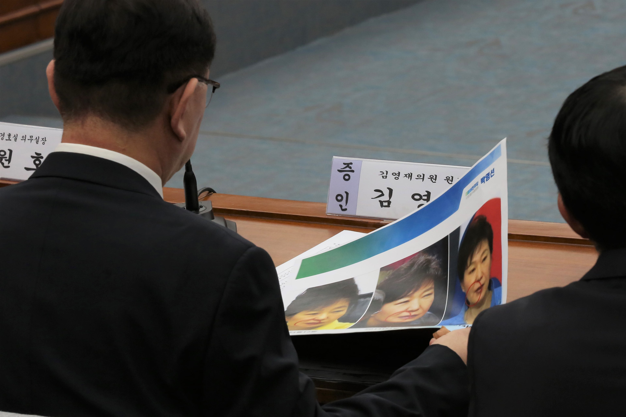 14일 국회에서 열린 '박근혜 정부의 최순실 등 민간인에 의한 국정농단 의혹사건 진실규명을 위한 국정조사특위 제3차 청문회'에서 김영재 김영재의원원장이 박영선 의원에게 전달받은 박근혜대통령의 미용시술 흔적이 보이는 사진자료를 살펴보고 있다.