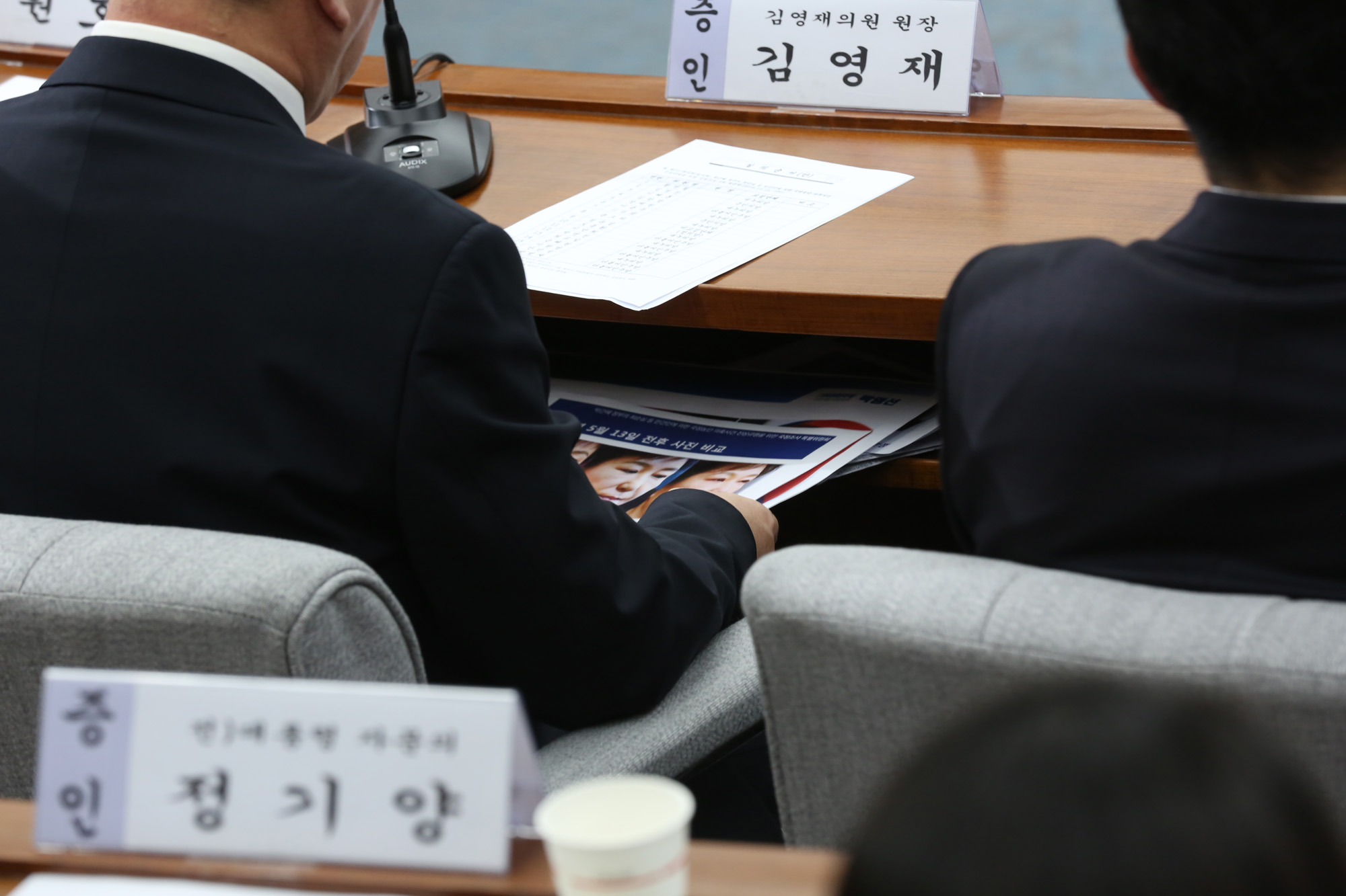 14일 국회에서 열린 '박근혜 정부의 최순실 등 민간인에 의한 국정농단 의혹사건 진실규명을 위한 국정조사특위 제3차 청문회'에서 김영재 김영재의원원장이 박영선 의원에게 전달받은 박근혜대통령의 미용시술 흔적이 보이는 사진자료를 살펴보고 있다.