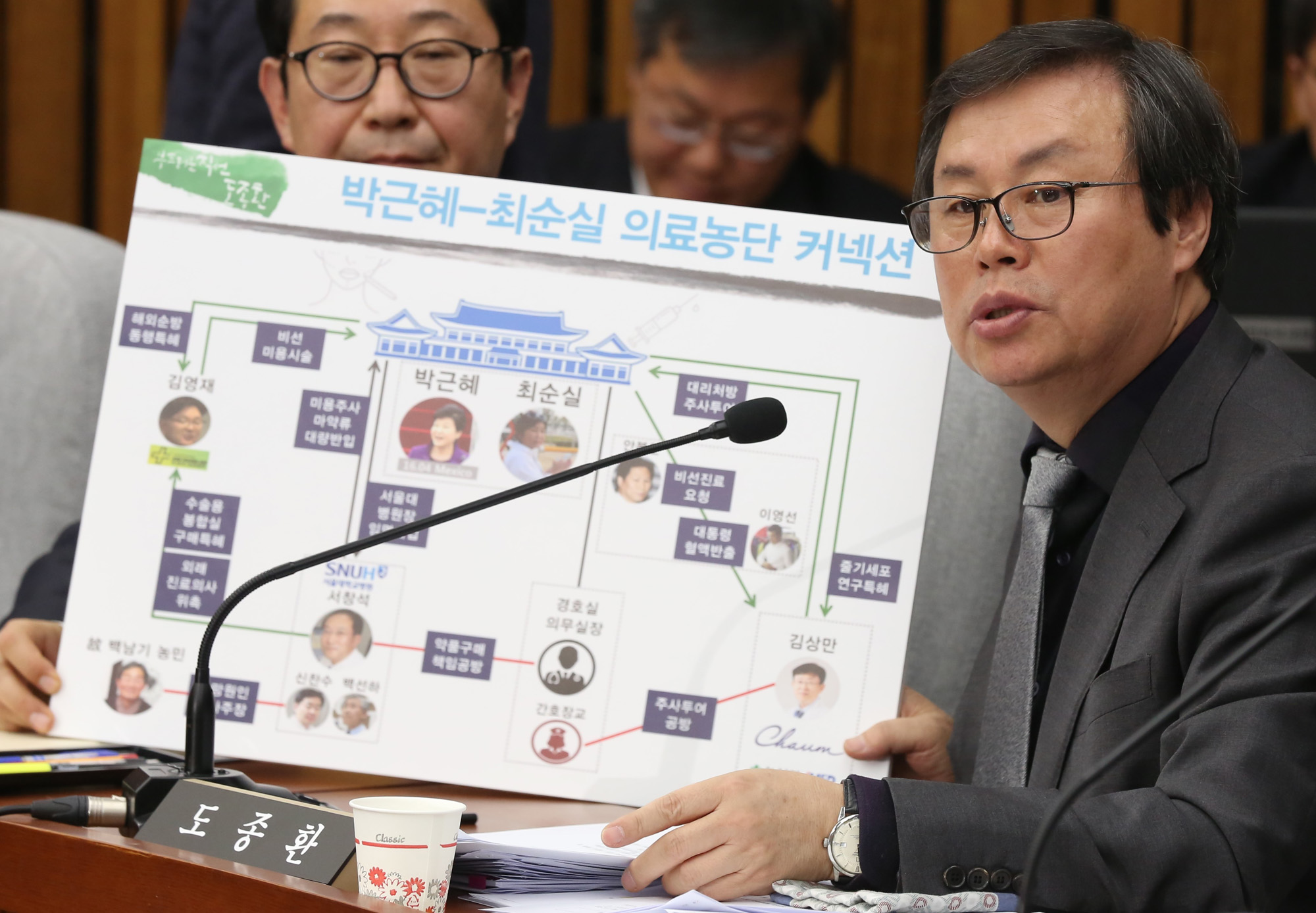14일 국회에서 열린 '박근혜 정부의 최순실 등 민간인에 의한 국정농단 의혹사건 진실규명을 위한 국정조사특위 제3차 청문회'에서 도종환 더불어민주당 의원이 '박근혜-최순실 의료농단 커넥션' 내용의 자료를 보이며 질의를 하고 있다.