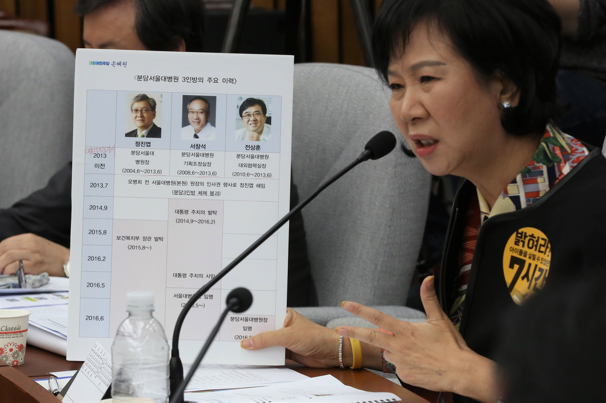 14일 국회에서 열린 '박근혜 정부의 최순실 등 민간인에 의한 국정농단 의혹사건 진실규명을 위한 국정조사특위 제3차 청문회'에서 손혜원 더불어민주당 의원이 '분당서울대병원' 의혹과 관련한 자료를 보이며 질의를 하고 있다.