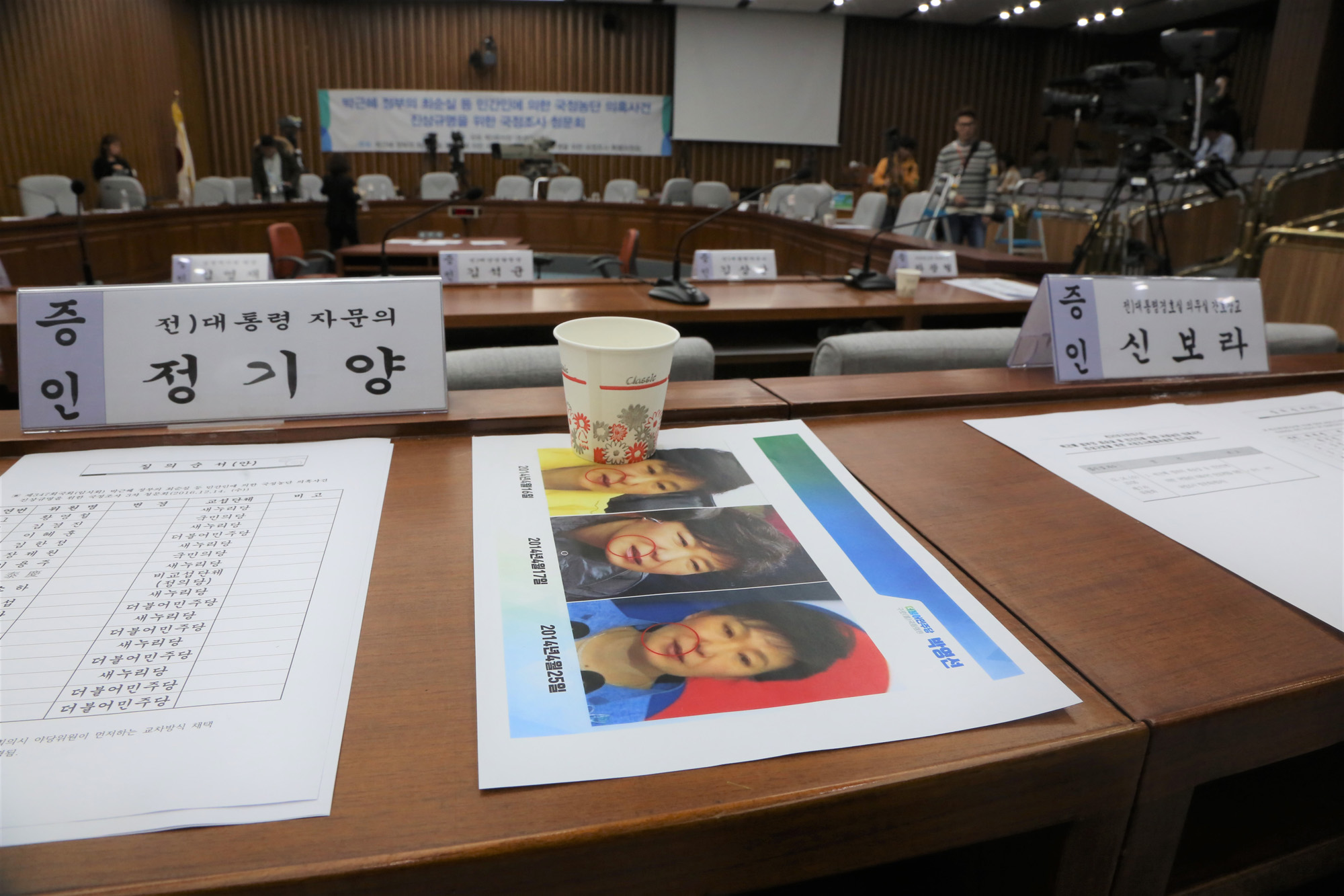 14일 국회에서 열린 '박근혜 정부의 최순실 등 민간인에 의한 국정농단 의혹사건 진실규명을 위한 국정조사특위 제3차 청문회'에서 오전 질의를 마친 증인들의 자리에 박근혜 대통령 시술의혹 사진자료가 남아 있다.