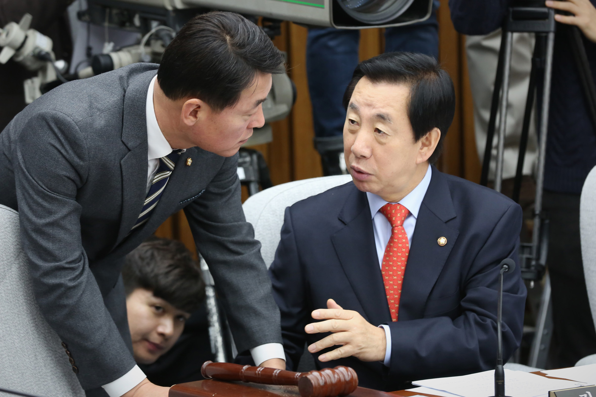 14일 오전 국회에서 열린 '박근혜 정부의 최순실 등 민간인에 의한 국정농단 의혹사건 진실규명을 위한 국정조사특위 제3차 청문회'에서 김성태 위원장이 황영철 의원과 이야기를 나누고 있다.