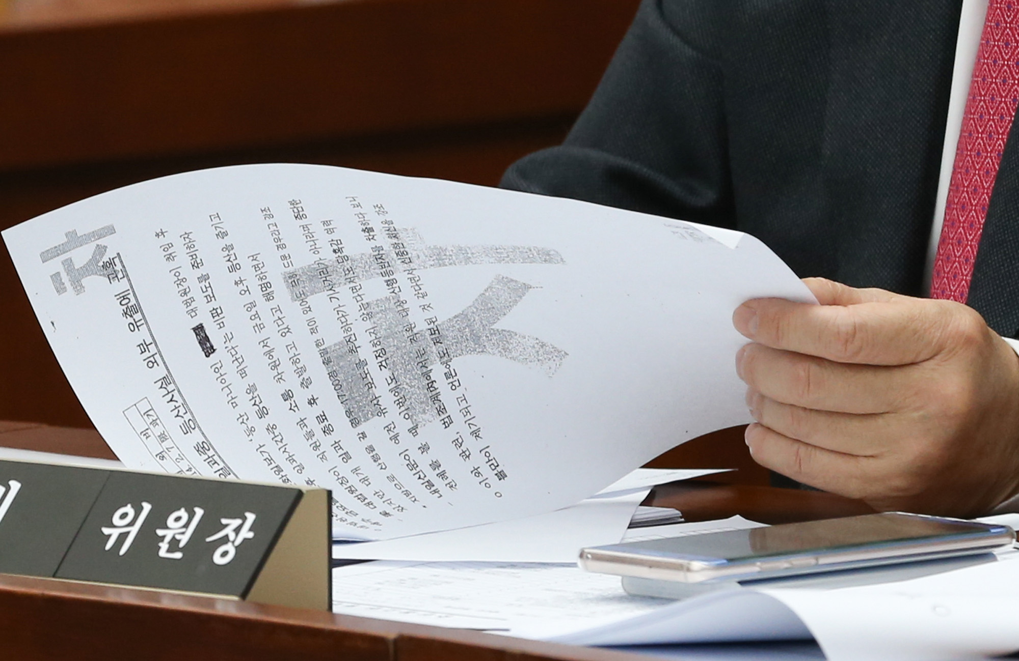 | 사진설명 | 김성태 국회 최순실 국정조사특별위원회 위원장이 15일 국회에서 열린 '박근혜 정부의 최순실 등 민간인에 의한 국정농단 의혹사건 진상규명을 위한 국정조사 특별위원회' 4차 청문회에서 조한규 전 세계일보 사장이 제출한 '청와대의 양승태 대법원장에 대한 사찰 문건'을 보고 있다. 2016.12.15/뉴스1 |