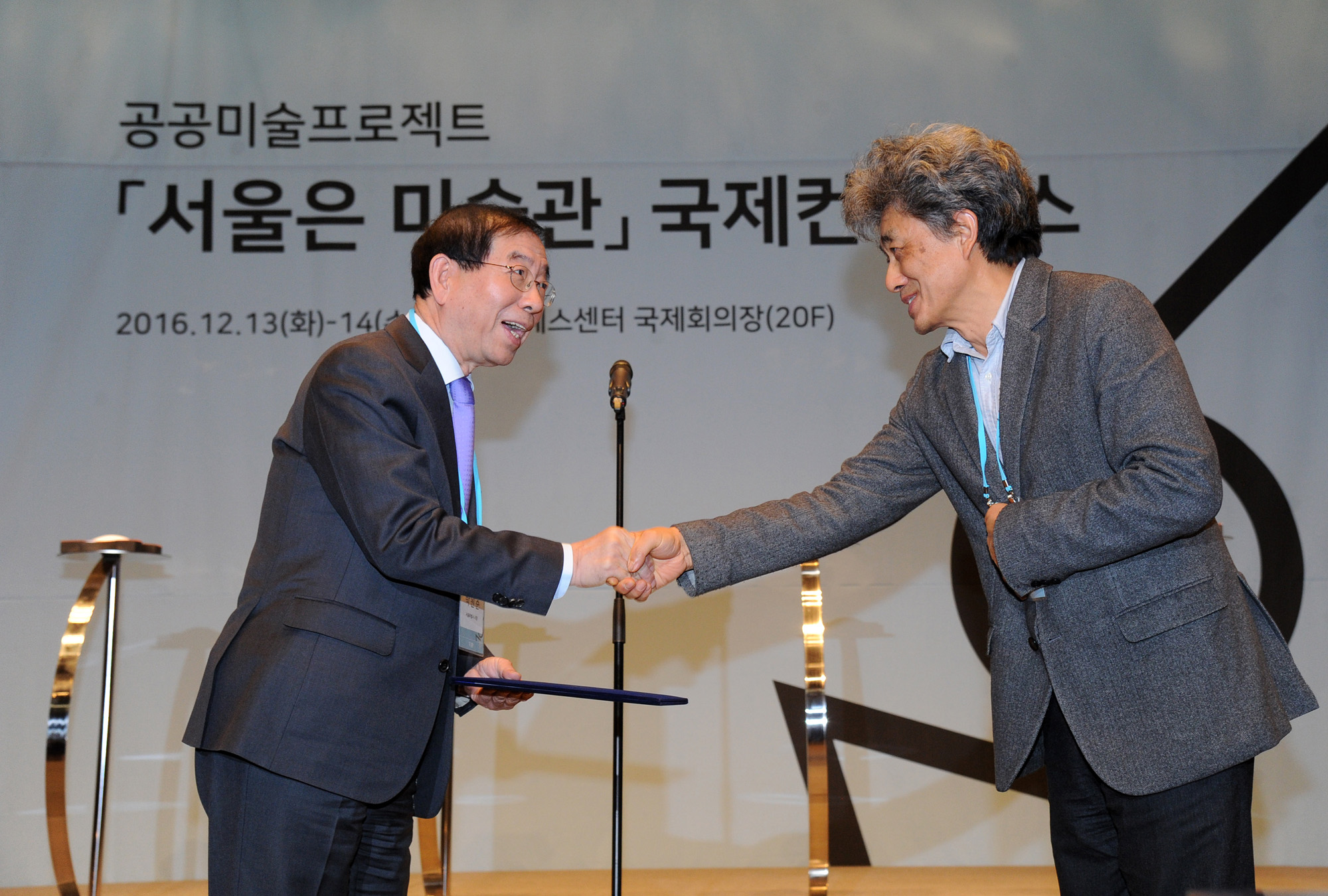 14일 서울 태평로 프레스센터에서 열린 '서울은 미술관' 국제 컨퍼런스에서 박원순 서울시장을 포함한 귀빈들이 선언 퍼포먼스를 하고 있다. 서울시 제공