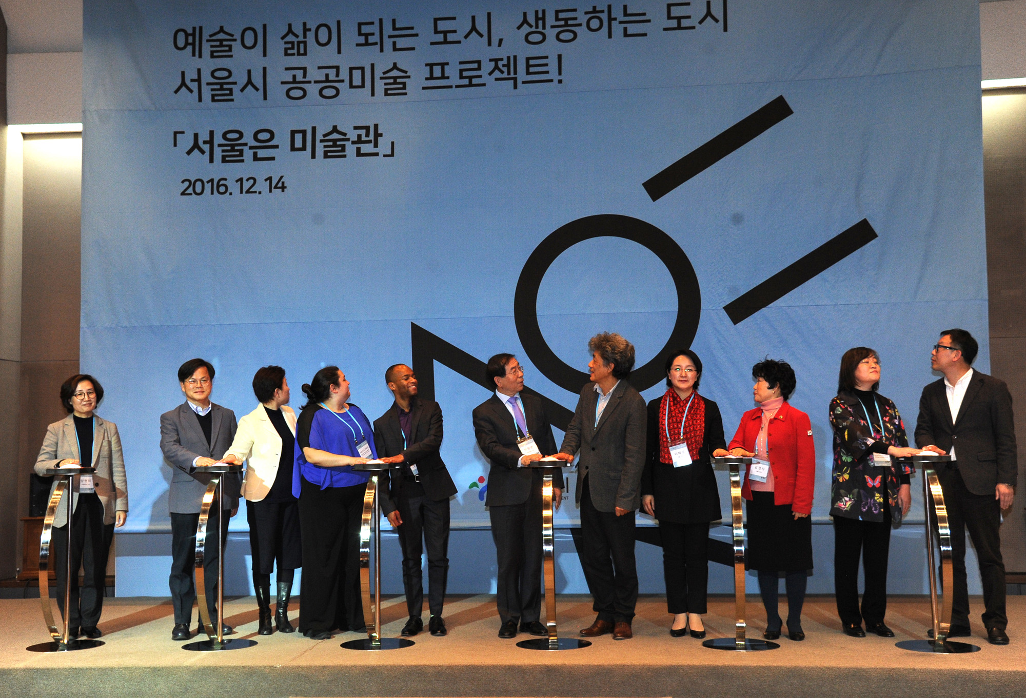 14일 서울 태평로 프레스센터에서 열린 '서울은 미술관' 국제 컨퍼런스에서 박원순 서울시장을 포함한 귀빈들이 선언 퍼포먼스를 하고 있다. 서울시 제공
