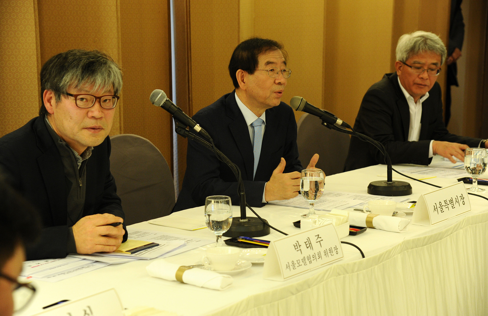 박원순 서울시장이 15일 오후 서울 중구 프레스센터에서 열린 '노사정 서울협약 1주년 기념 정책간담회'에 참석, 노사 관계자들과 축하케이크를 자르고 있다. 서울시 제공