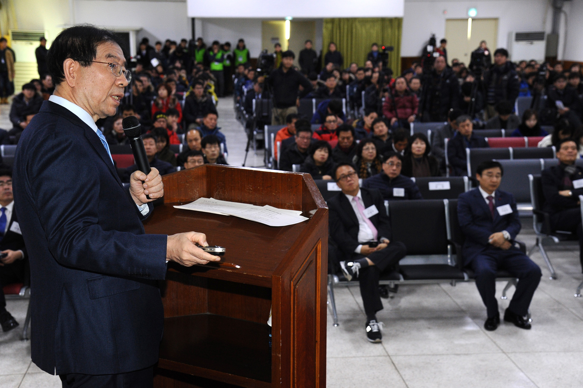 박원순 서울시장이 15일 오후 서울시 민방위교육장에서 열린 ‘중랑천 중심, 동북권 미래비전’ 현장설명회에서 사업 계획을 설명하고 있다. 서울시 제공