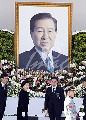 23일 오후 서울 여의도 국회에서 고 김대중 전 대통령의 영결식이 진행됐다. 이명박 대통령과 김윤옥 여사가 헌화하고 돌아서고 있다.