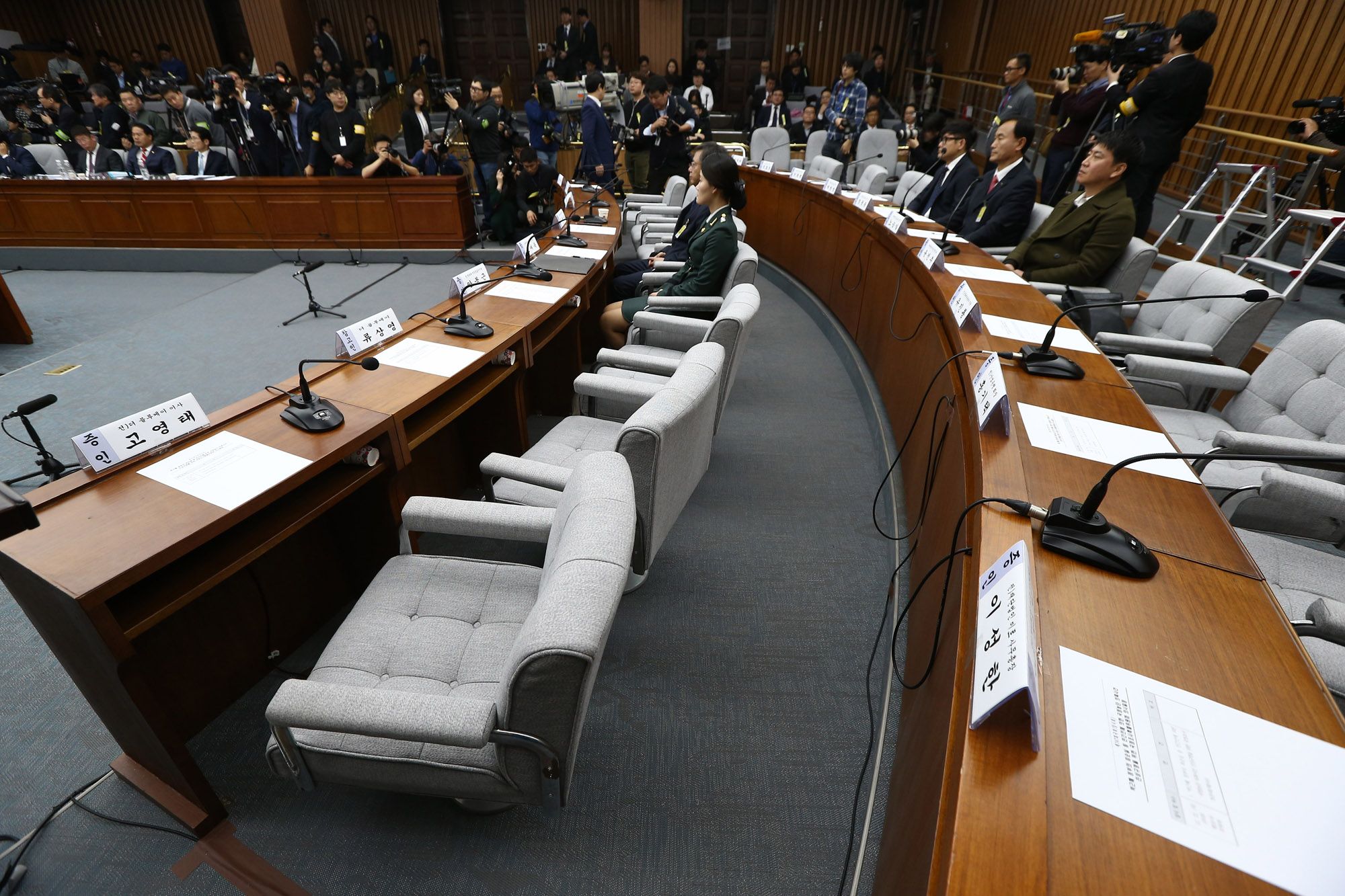 | 사진설명 | 22일 오전 서울 여의도 국회에서 열린 '박근혜 정부의 최순실 등 민간인에 의한 국정농단 의혹 사건 진상 규명을 위한 국회 국정조사특별위원회 제5차 청문회'에 우병우 전 청와대 민정수석비서관과 전 청와대경호실 간호장교인 조여옥 대위가 증인으로 출석한 가운데 다수의 증인들이 불출석해 증인석이 비어있다.2016.12.22 사진 공동취재단 |