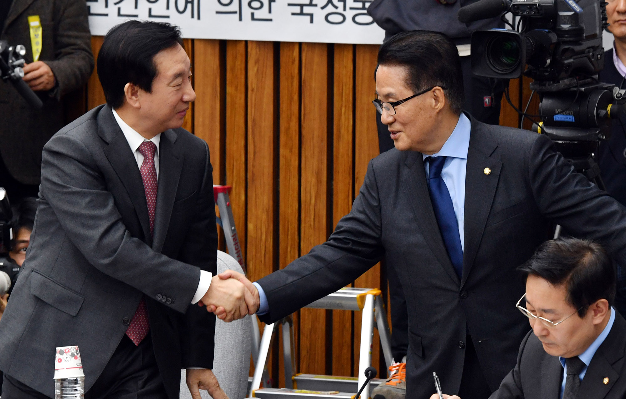 김성태 위원장(왼쪽)이 22일 오전 서울 여의도 국회에서 열린 '박근혜 정부의 최순실 등 민간인에 의한 국정농단 의혹사건 진상규명을 위한 국정조사' 제5차 청문회에서 청문회장을 찾은 박지원 국민의당 원내대표와 악수를 나누고 있다. . 2016.12.22 사진 공동취재단