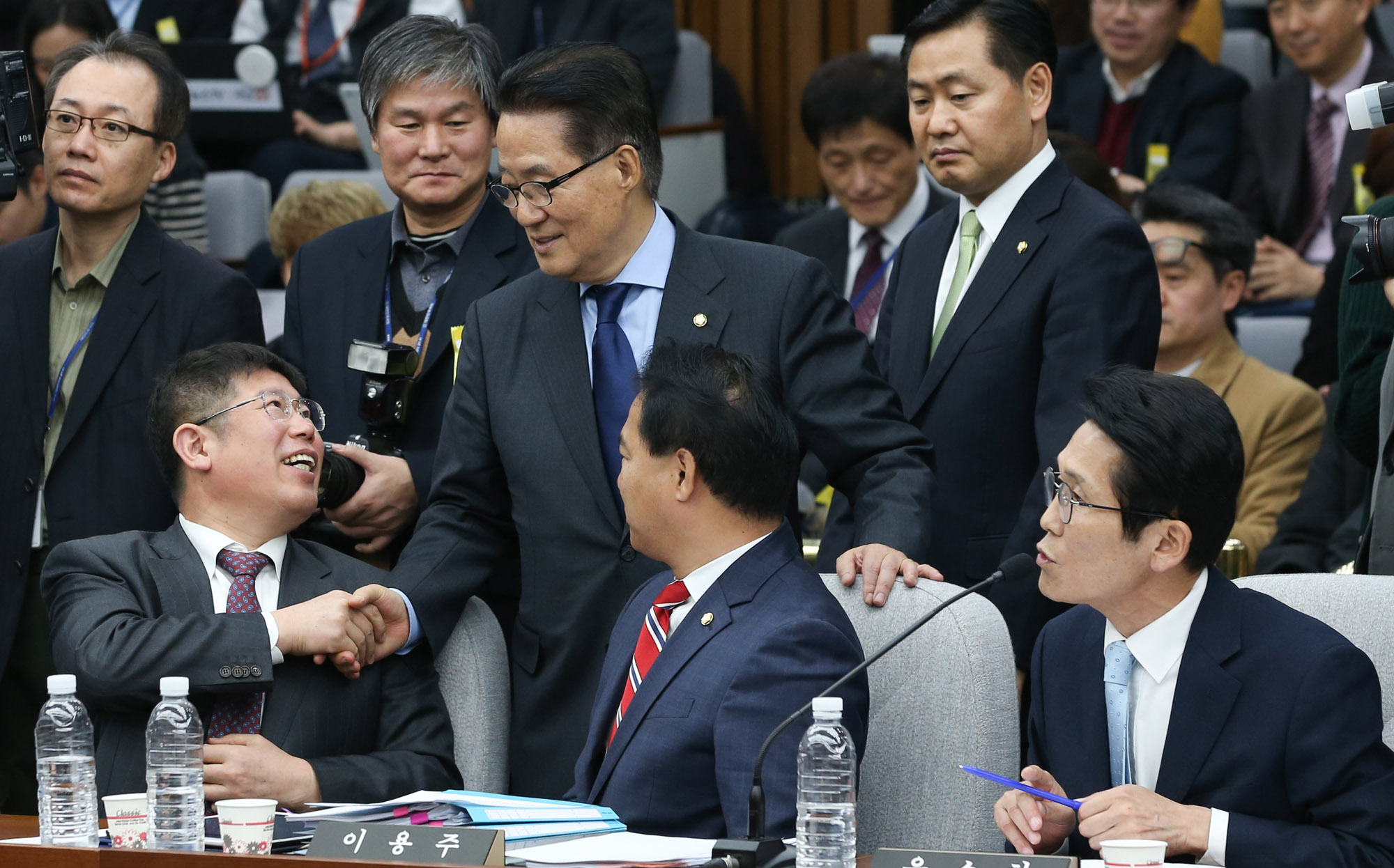 박지원 국민의당 원내대표가 22일 서울 여의도 국회에서 열린 박근혜 정부의 최순실 등 민간인에 의한 국정농단 의혹사건 진실규명을 위한 국정조사특위 제5차 청문회장을 찾아 김경진 의원과 인사하고 있다.. 2016.12.22 사진 공동취재단