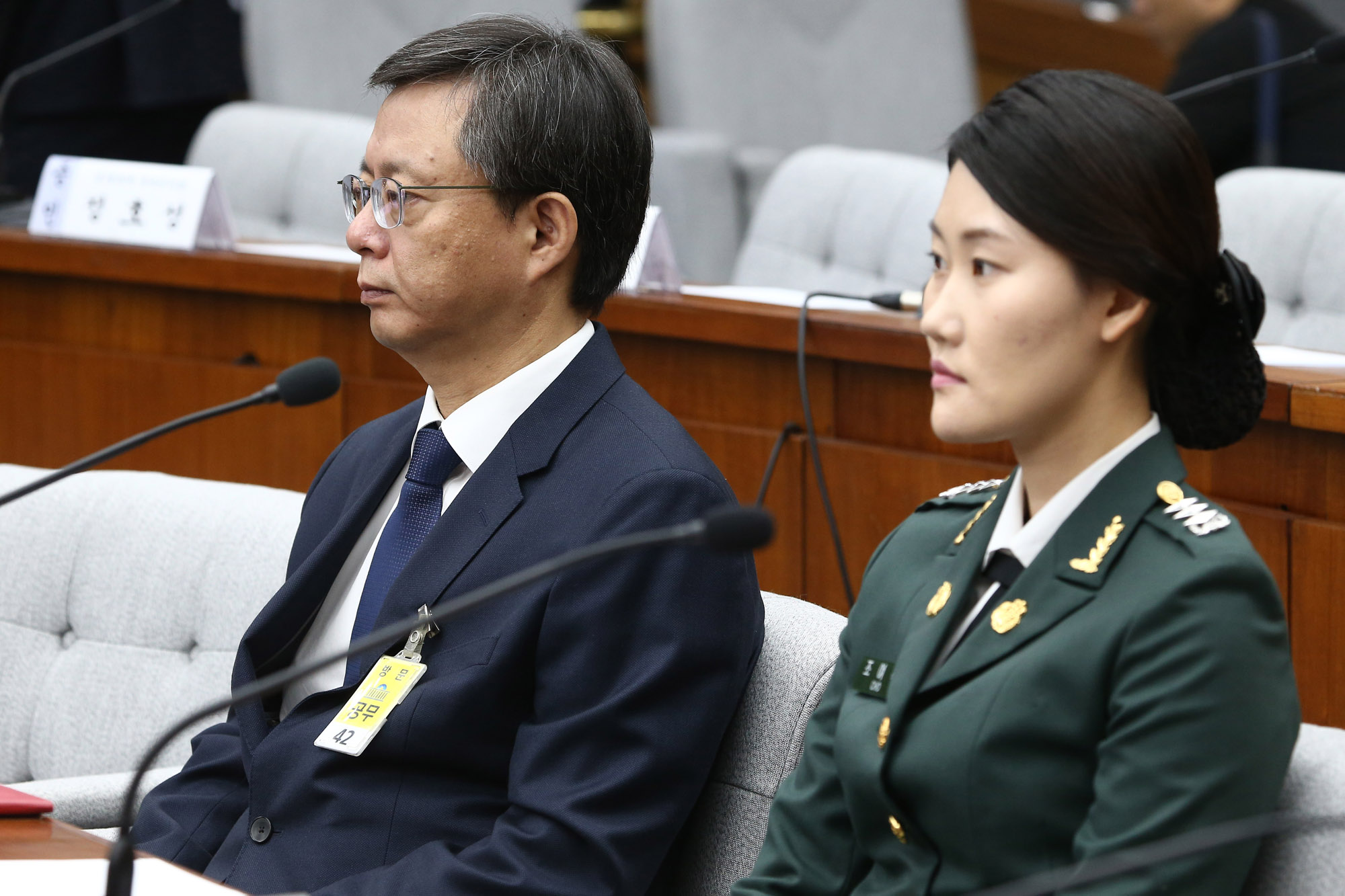 우병우 전 청와대 민정수석비서관(왼쪽)과 전 대통령경호실 간호장교인 조여옥 대위가 22일 오전 서울 여의도 국회에서 열린 '박근혜 정부의 최순실 등 민간인에 의한 국정농단 의혹 사건 진상 규명을 위한 국회 국정조사특별위원회 제5차 청문회'에 증인으로 출석해 있다.2016.12.22 사진 공동취재단