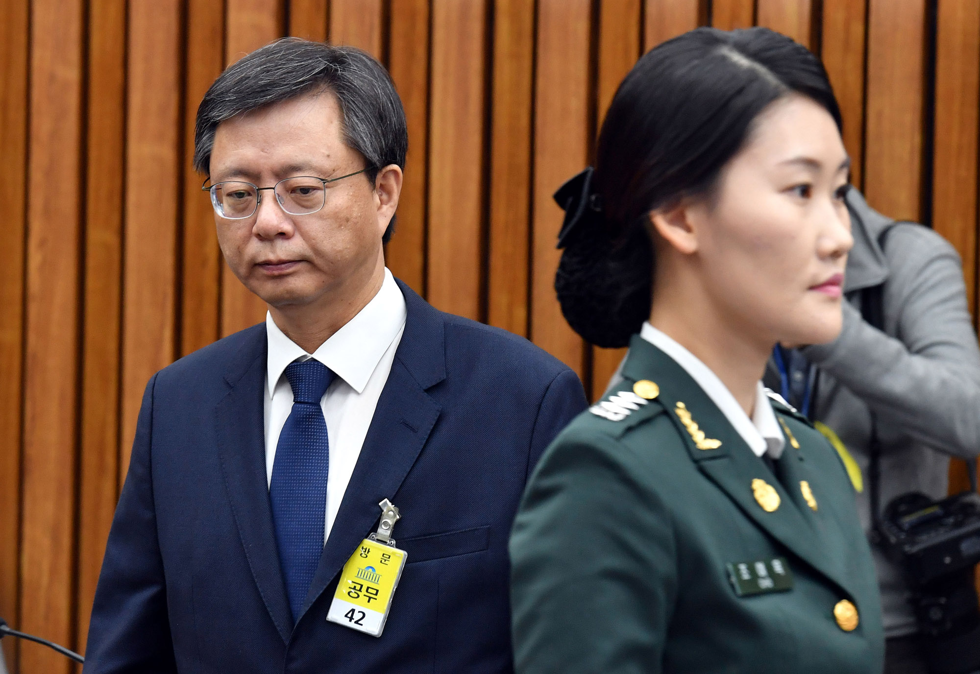 우병우 전 청와대 민정수석(왼쪽)이 22일 오전 서울 여의도 국회에서 열린 '박근혜 정부의 최순실 등 민간인에 의한 국정농단 의혹사건 진상규명을 위한 국정조사' 제5차 청문회에서 증인선서 후 자리로 돌아오고 있다. . 2016.12.22 사진 공동취재단