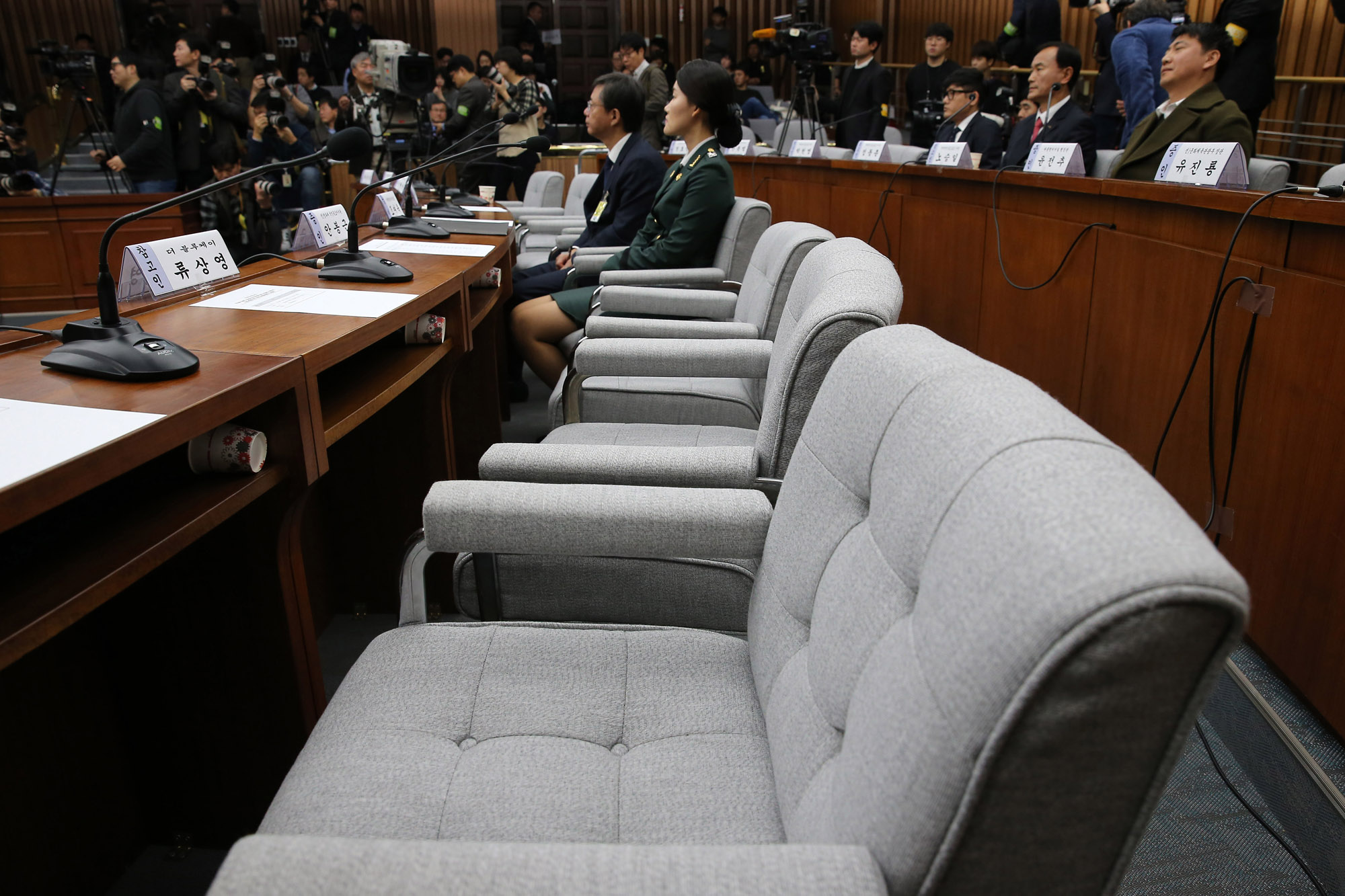 의혹사건 진실규명을 위한 국정조사특위 제5차 청문회에 우병우 전 청와대 민정수석, 조여옥 전 청와대 의무실 간호장교를 제외한 최순실과 정유라 등 대부분의 증인들이 불참해 빈자리가 보이고 있다.