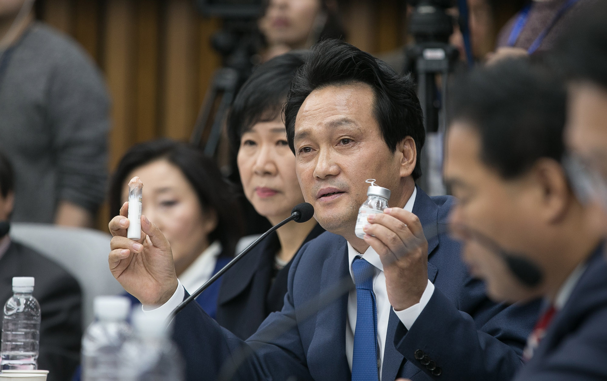 안민석 더불어민주당 의원이 22일 오전 국회에서 열린 '박근혜 정부의 최순실 등 민간인에 의한 국정농단 의혹사건 진상규명을 위한 국정조사 특별위원회' 5차 청문회서 프로포폴을 들어보이고 있다.