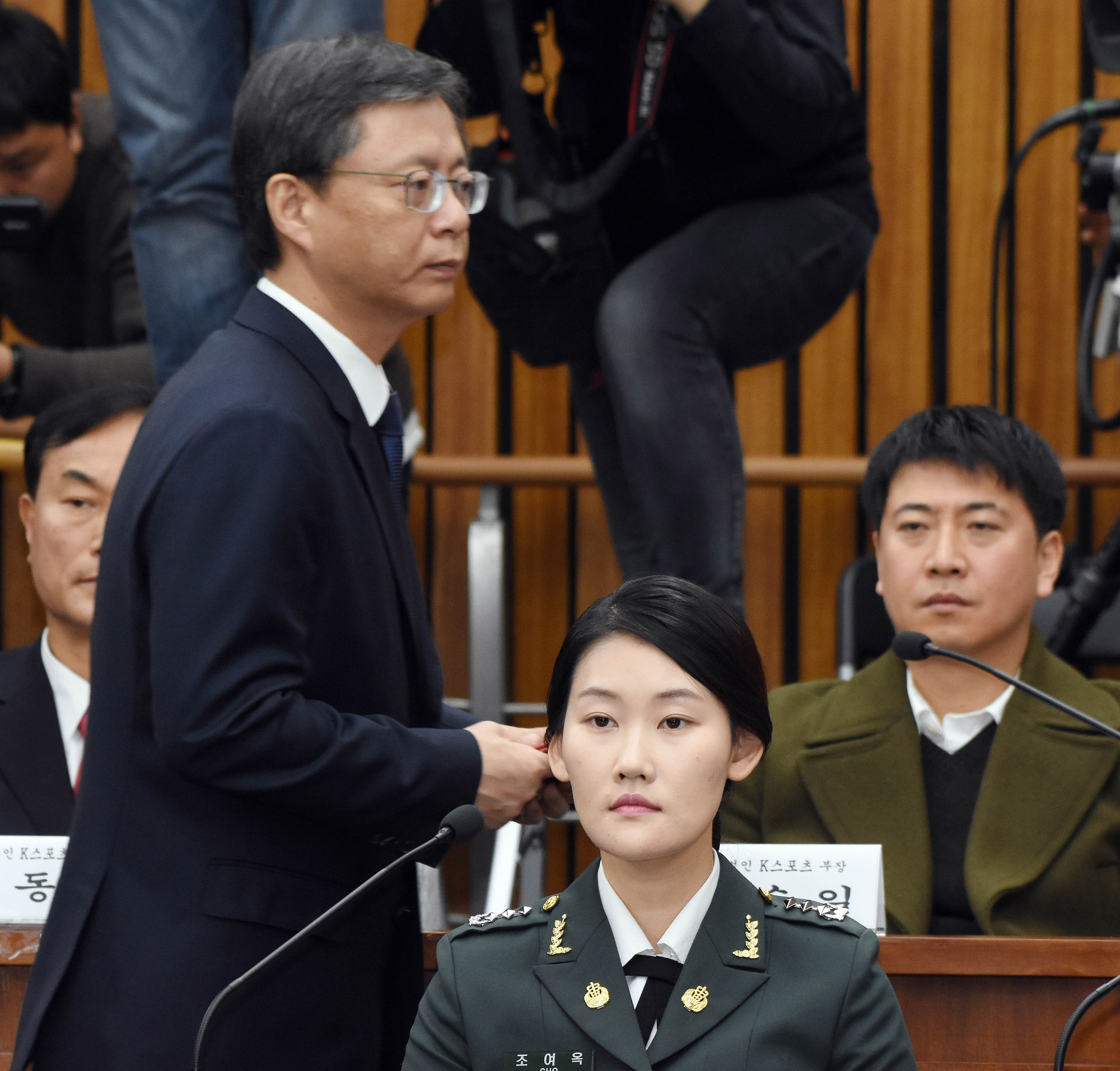 | 사진설명 | 22일 서울 여의도 국회에서 열린 '박근혜 정부의 최순실 등 민간인에 의한 국정농단 의혹 사건 진상 규명을 위한 국정조사 특별위원회'에 증인으로 출석한 우병우 전 청와대 민정수석이 증인 선서를 위해 선서대로 걸어가고 있다. 앞줄 중앙에는 세월호 7시간 의혹의 핵심 증인으로 주목받고 있는 조여옥 전 청와대 간호장교.2016.12.22 사진공동취재단 |
