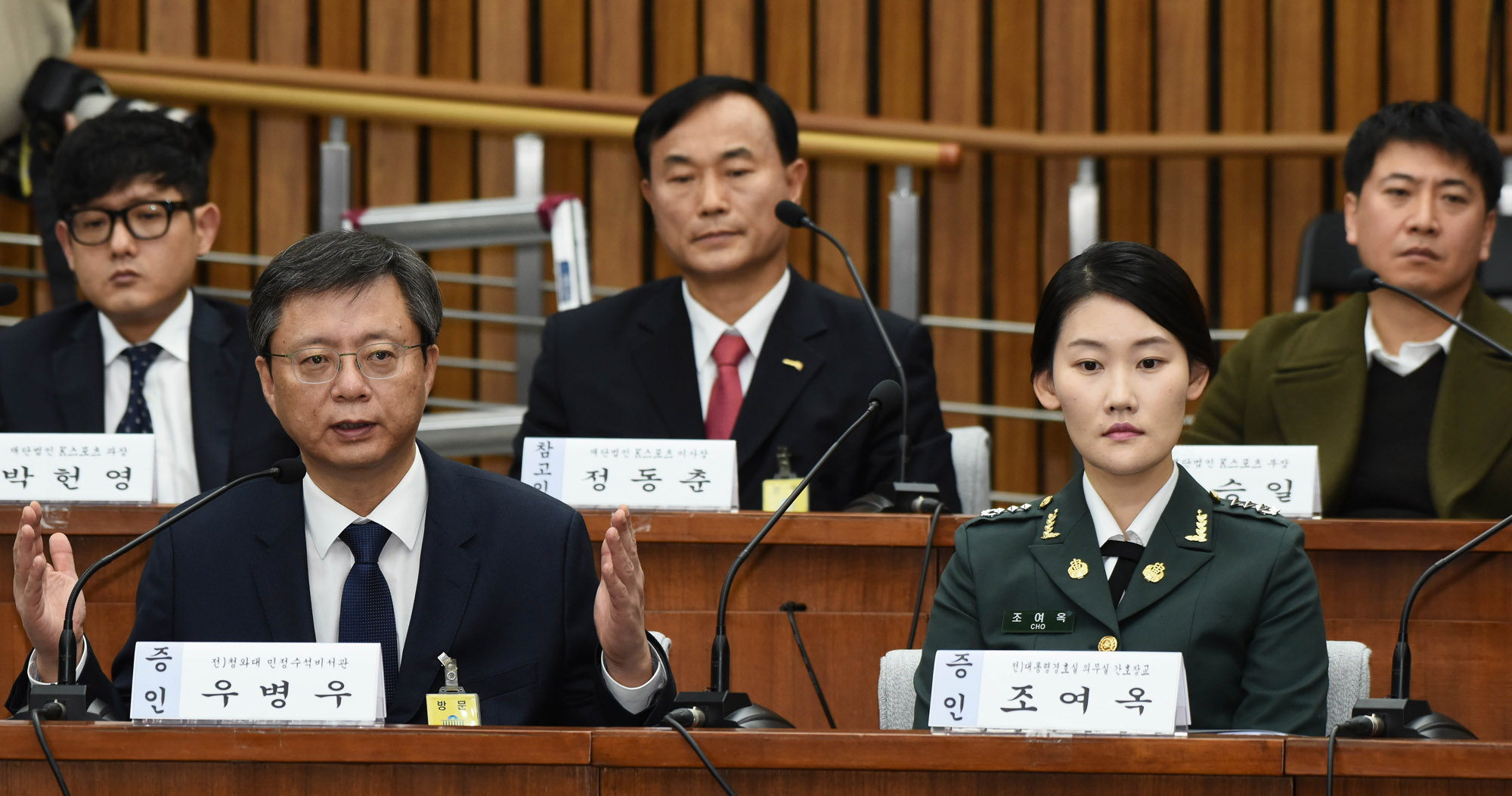 | 사진설명 | 22일 서울 여의도 국회에서 열린 '박근혜 정부의 최순실 등 민간인에 의한 국정농단 의혹 사건 진상 규명을 위한 국정조사 특별위원회'에 증인으로 출석한 우병우 전 청와대 민정수석(앞줄 왼쪽)이 증인으로 출석 의원들의 질문에 답변을 하고 있다. 바로 옆에는 세월호 7시간 의혹의 핵심 증인으로 주목받고 있는 조여옥 전 청와대 간호장교.2016.12.22 사진공동취재단 |