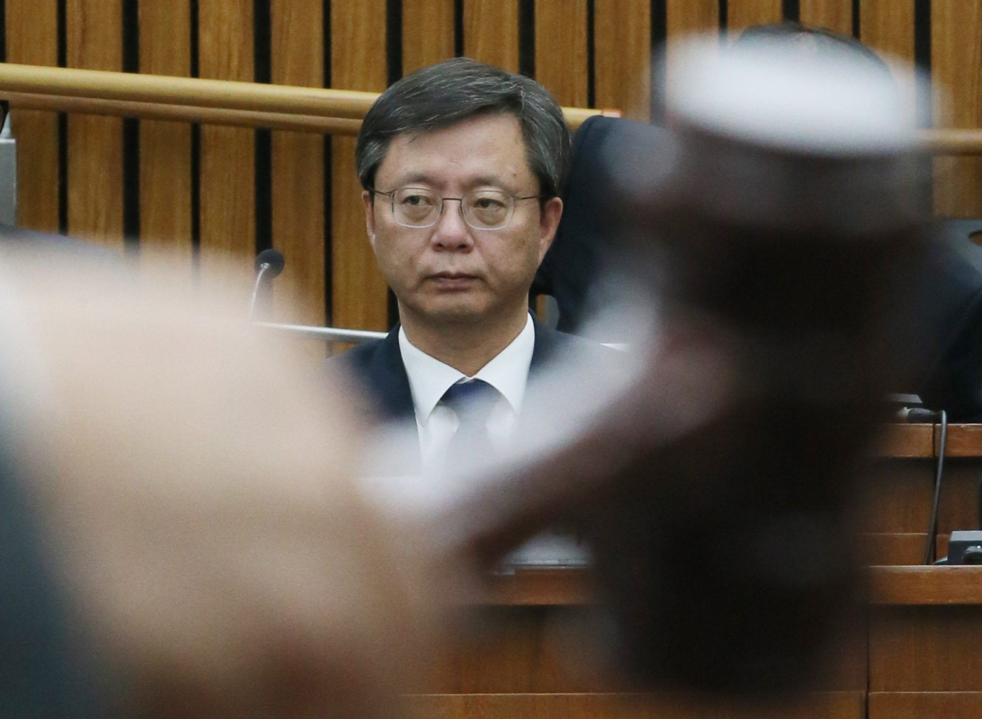 22일 서울 여의도 국회에서 열린 '박근혜 정부의 최순실 등 민간인에 의한 국정농단 의혹사건 진실규명을 위한 국정조사특위 제5차 청문회'에서 김성태 위원장이 두드리는 의사봉 뒤로 우병우 전 청와대 민정수석이 보이고 있다. 2016.12.22 사진공동취재단