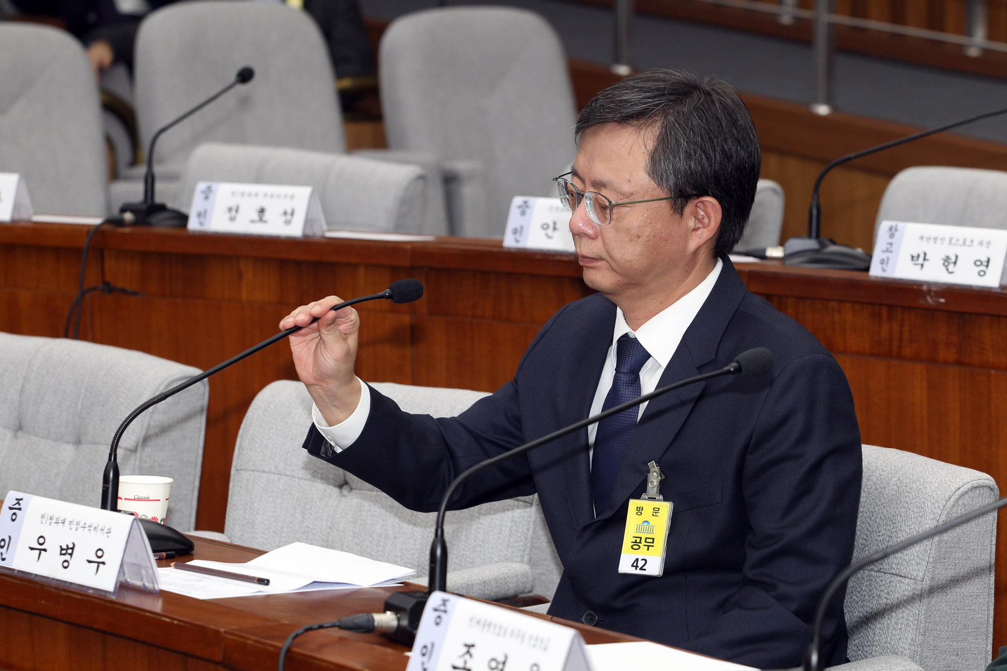 22일 오전 국회에서 열린'박근혜정부의 최순실등 민간인에 의한 국정농단 의혹사건 진실규명을 위한 국정조사 특위 제5차 청문회'에서 증인으로 나온 우병우 전 민정수석이 답변을 하기위해 마이크를 붙잡고 있다.