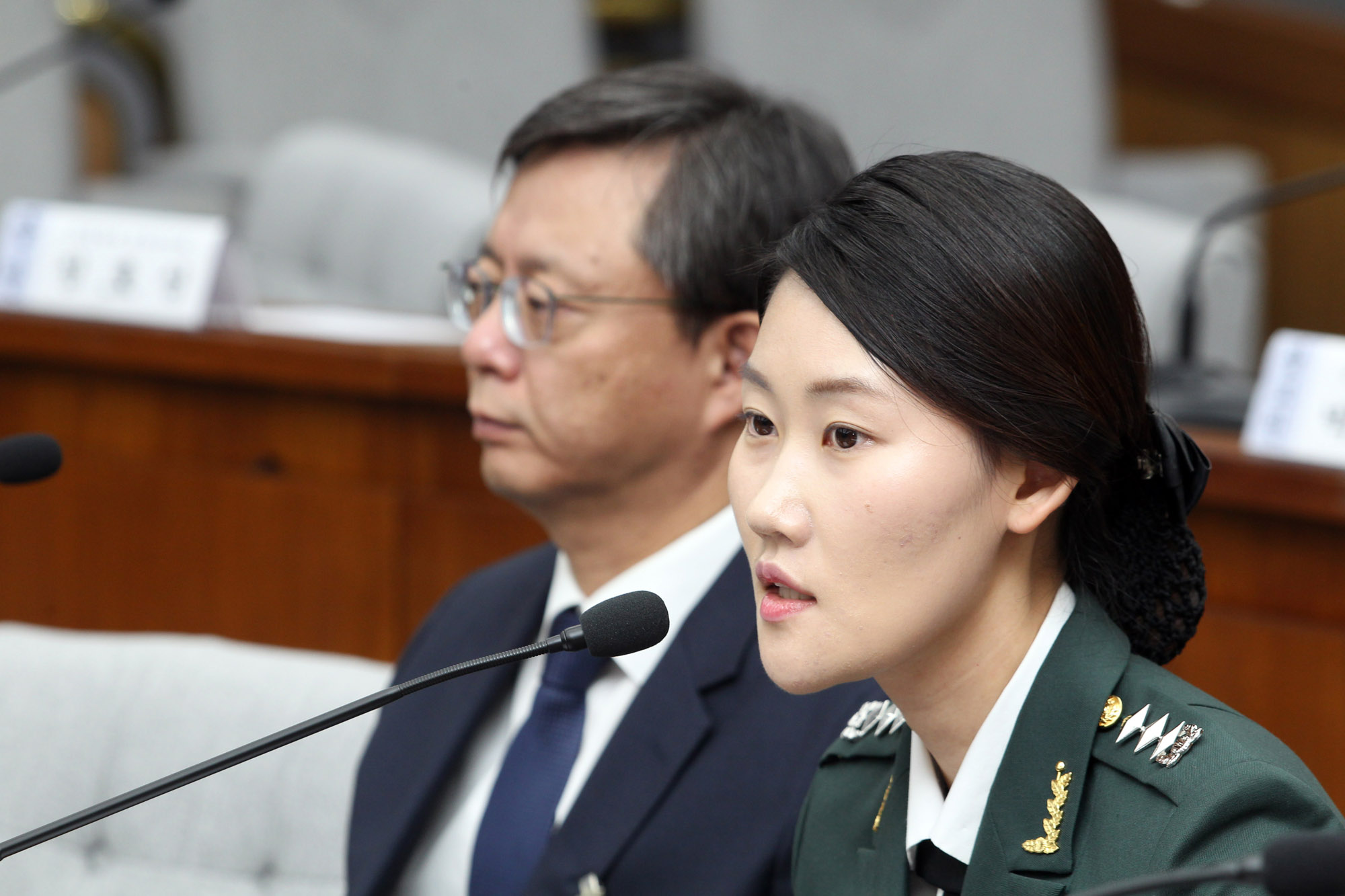 22일 오전 국회에서 열린'박근혜정부의 최순실등 민간인에 의한 국정농단 의혹사건 진실규명을 위한 국정조사 특위 제5차 청문회'에서 증인으로 나온 조여옥 대위가 질의에 답하고 있다.