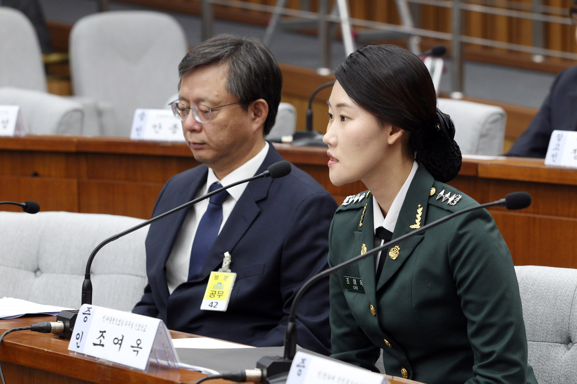 22일 오전 국회에서 열린'박근혜정부의 최순실등 민간인에 의한 국정농단 의혹사건 진실규명을 위한 국정조사 특위 제5차 청문회'에서 증인으로 나온 조여옥 대위가 질의에 답하고 있다.