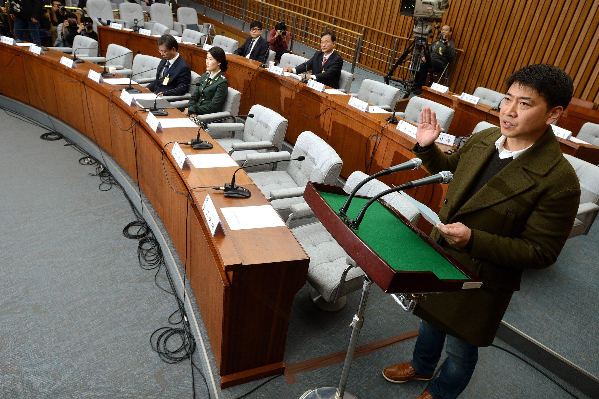 참고인 신분에서 증인신분으로 전환된 K 스포츠 재단 노승일 부장이 22일 오전 서울 여의도 국회에서 열린 박근혜정부의 최순실 등 민간인에 의한 국정농단 의혹 사건 진상규명을 위한 국정조사 특별위원회 청문회에서 증인선서를 하고 있다.