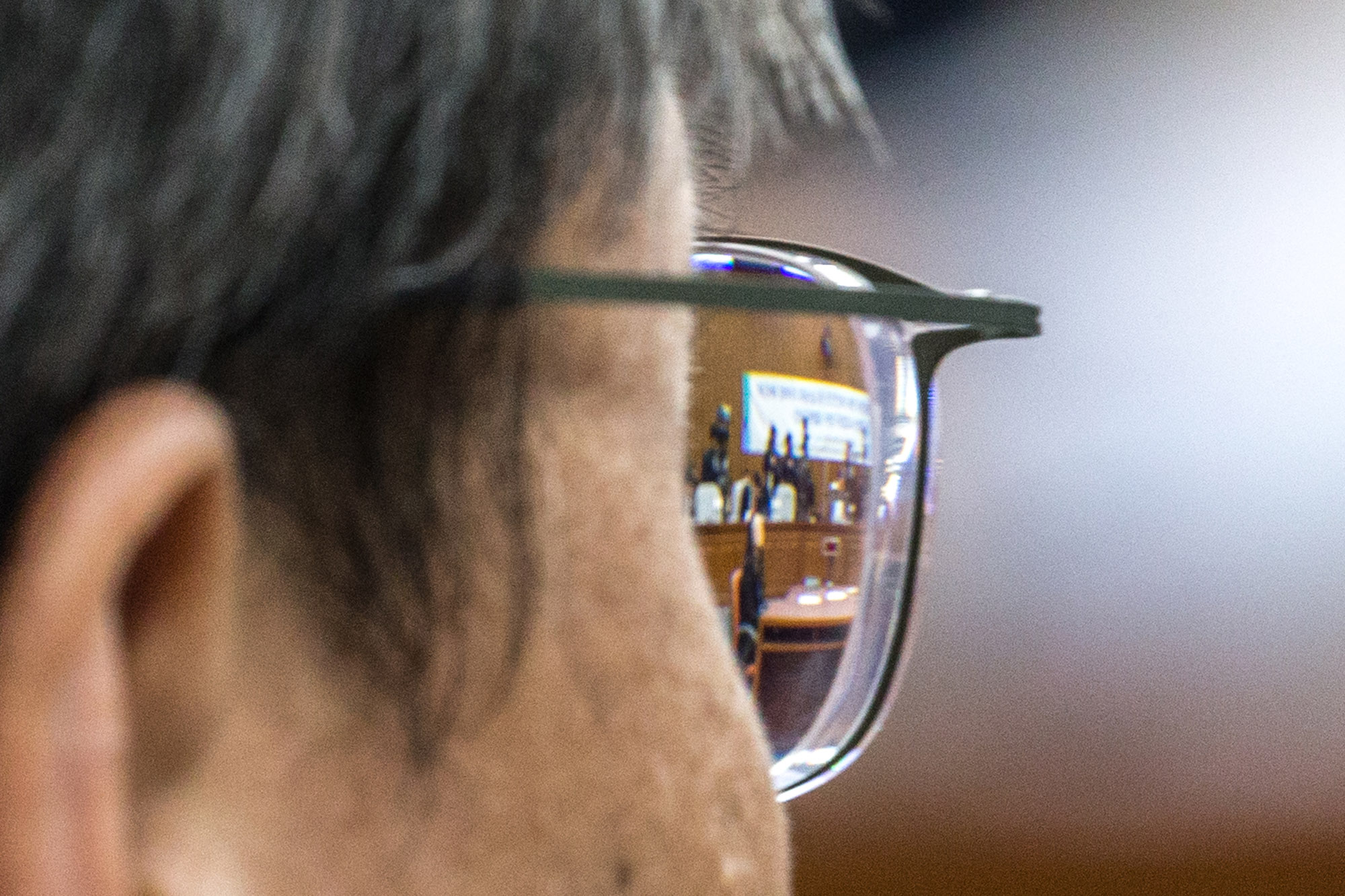 우병우 전 청와대 민정수석이 22일 오후 서울 여의도 국회에서 열린 박근혜 정부의 최순실 등 민간인에 의한 국정농단 의혹사건 진상규명을 위한 국정조사 제5차 오후 청문회에 참석한 우병우 전 민정수석의 안경에 청문회장이 보이고 있다.2016.12.22 사진공동취재단