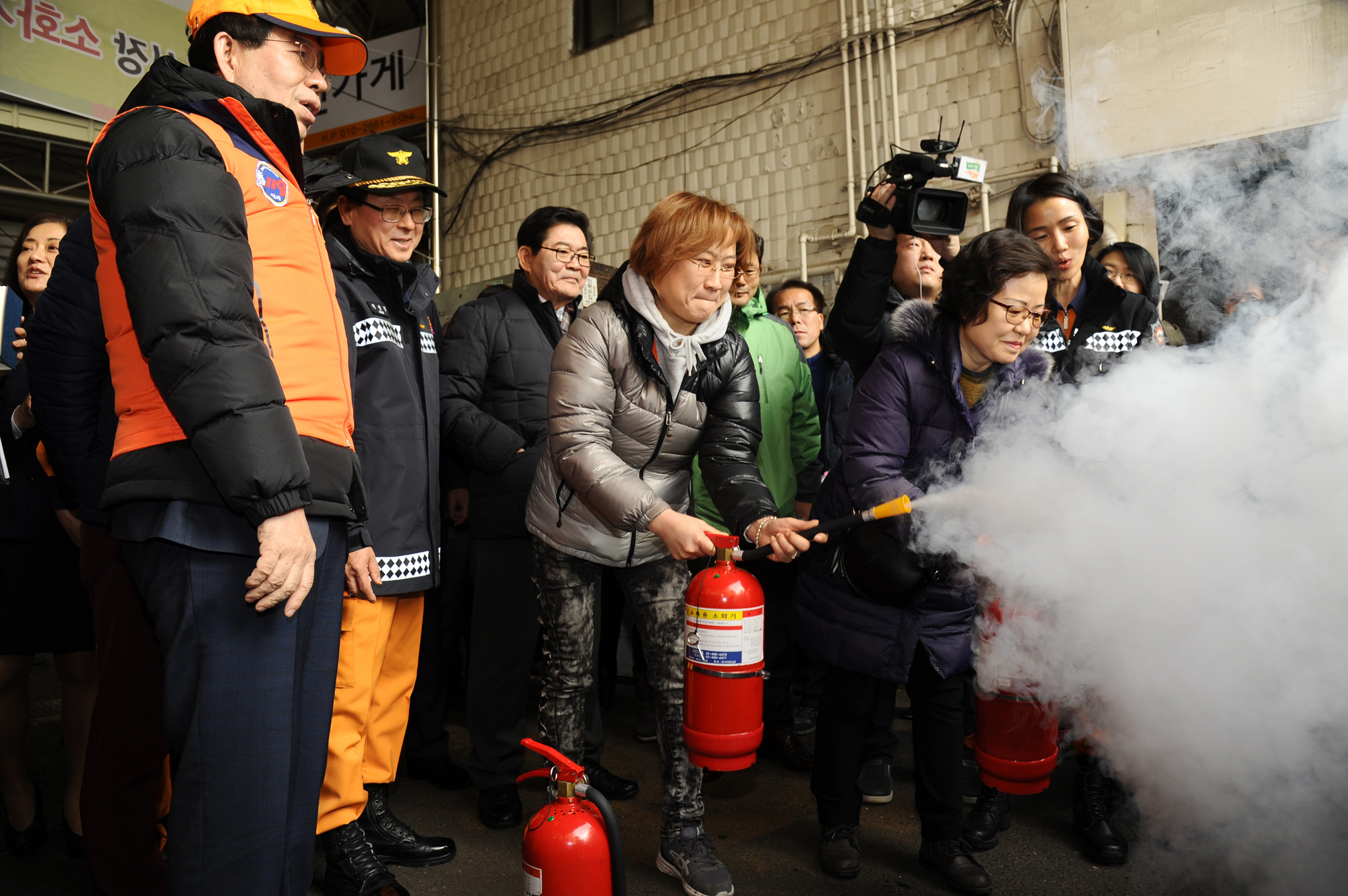 박원순 서울시장이 19일 오후 서울 광진구 자양골목시장을 방문해 시장에 설치 된 소방시설을 살피고 있다. 서울시 제공