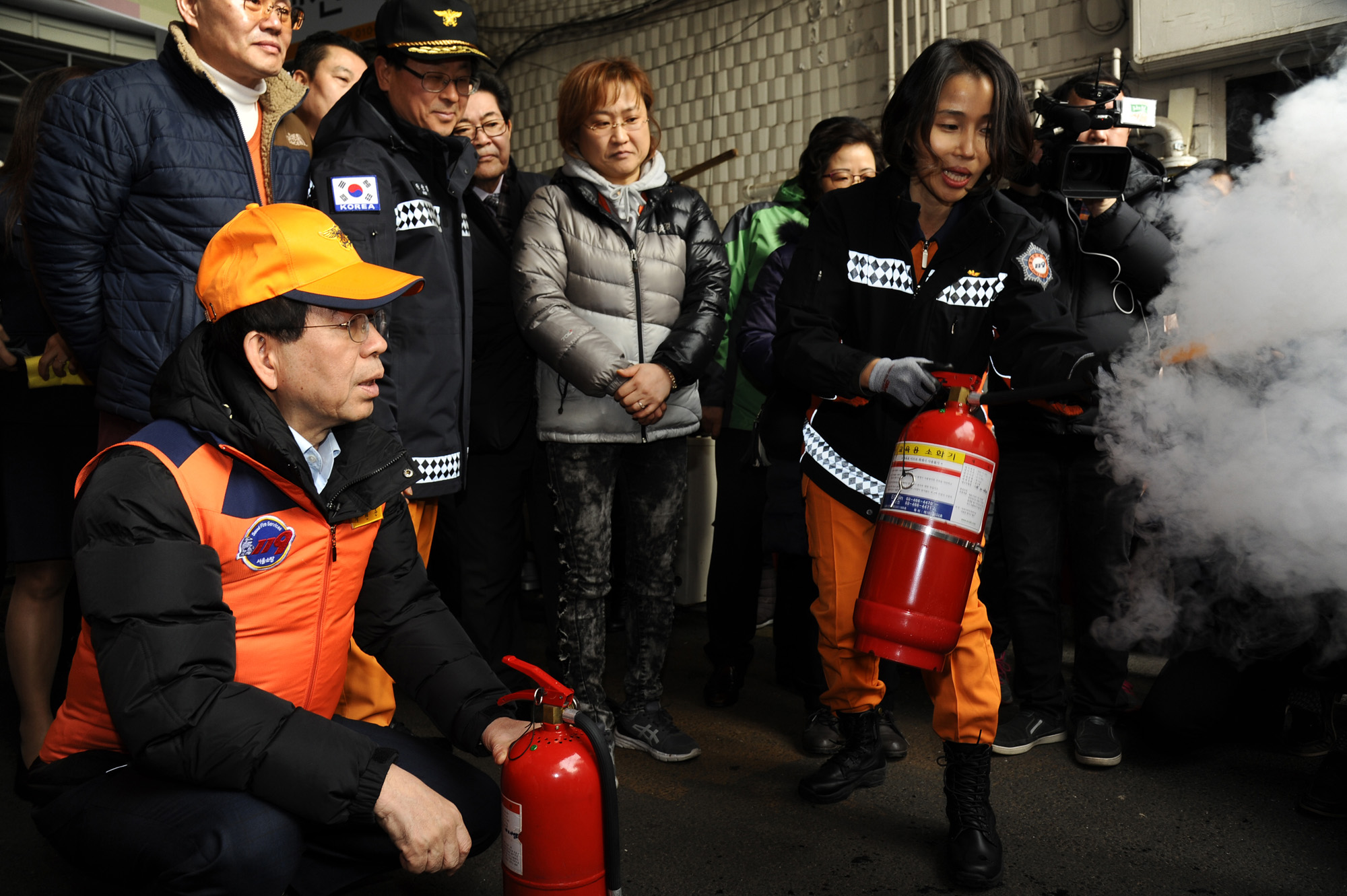 박원순 서울시장이 19일 오후 서울 광진구 자양골목시장을 방문해 시장에 설치 된 소방시설을 살피고 있다. 서울시 제공