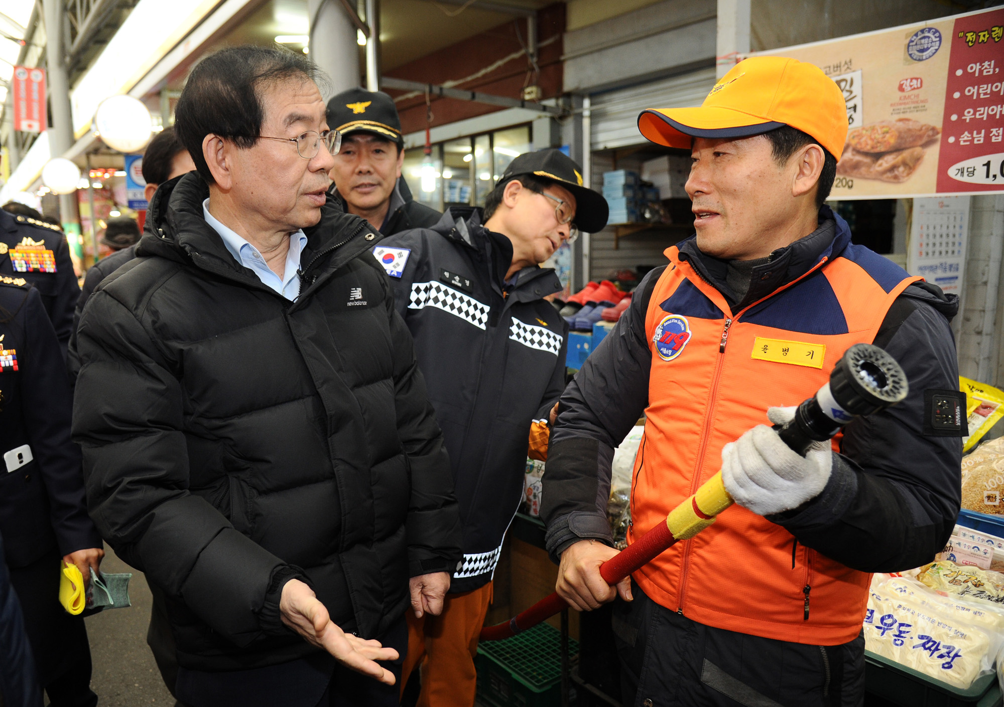 박원순 서울시장이 19일 오후 서울 광진구 자양골목시장을 방문해 시장에 설치 된 소방시설을 살피고 있다. 서울시 제공