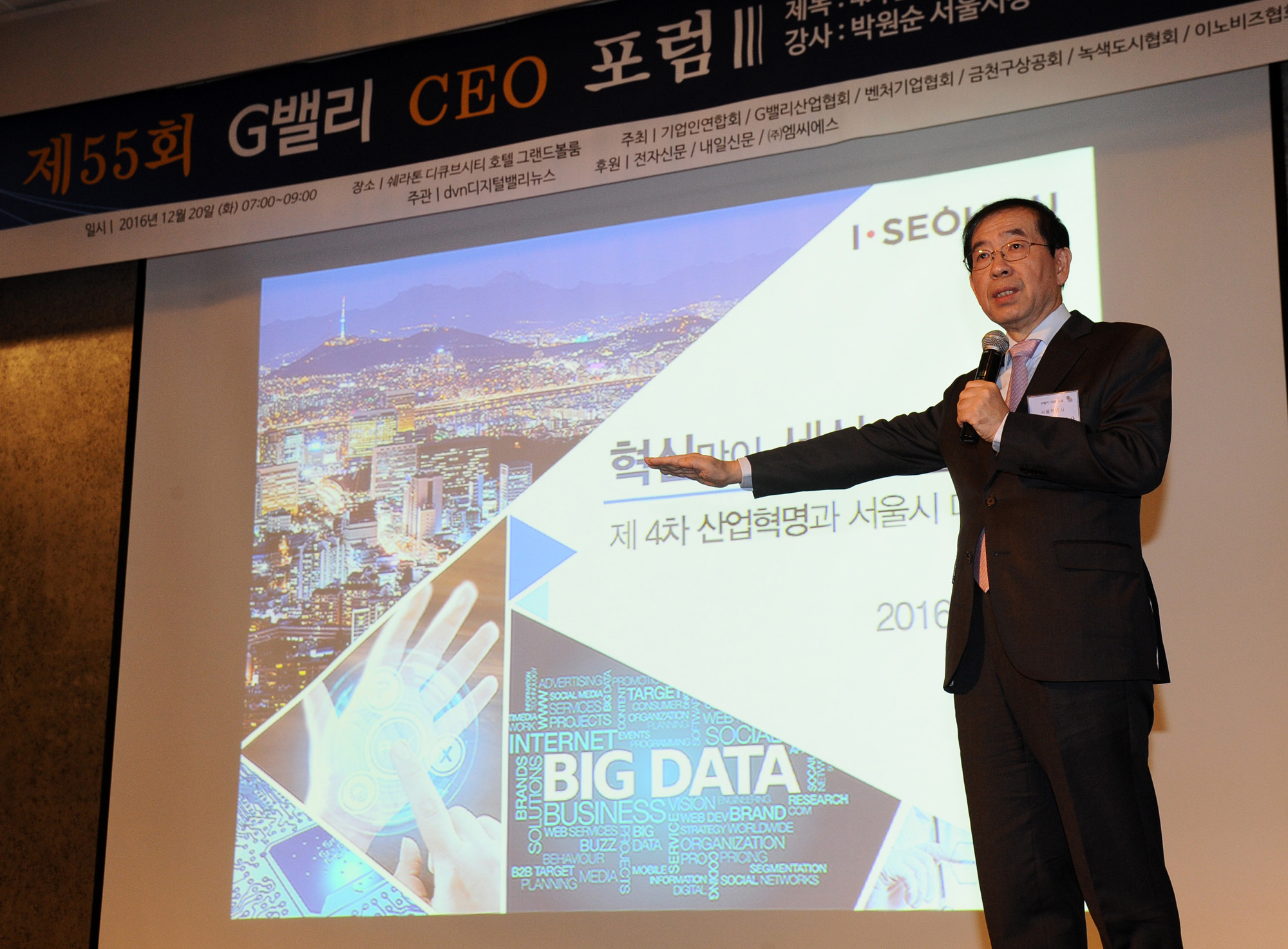 박원순 서울시장이 20일 오전 서울 구로구 쉐라톤 디큐브시티 호텔에서 열린 G밸리 CEO포럼에서 '4차산업혁명과 대한민국 중소기업이 나아갈 길'이란 주제로 강연을 하고 있다. 서울시 제공
