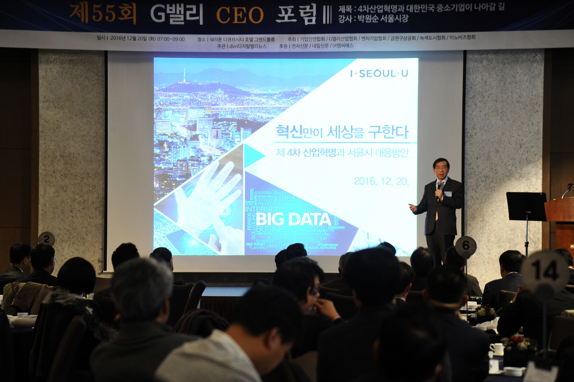 박원순 서울시장이 20일 오전 서울 구로구 쉐라톤 디큐브시티 호텔에서 열린 G밸리 CEO포럼에서 '4차산업혁명과 대한민국 중소기업이 나아갈 길'이란 주제로 강연을 하고 있다. 서울시 제공