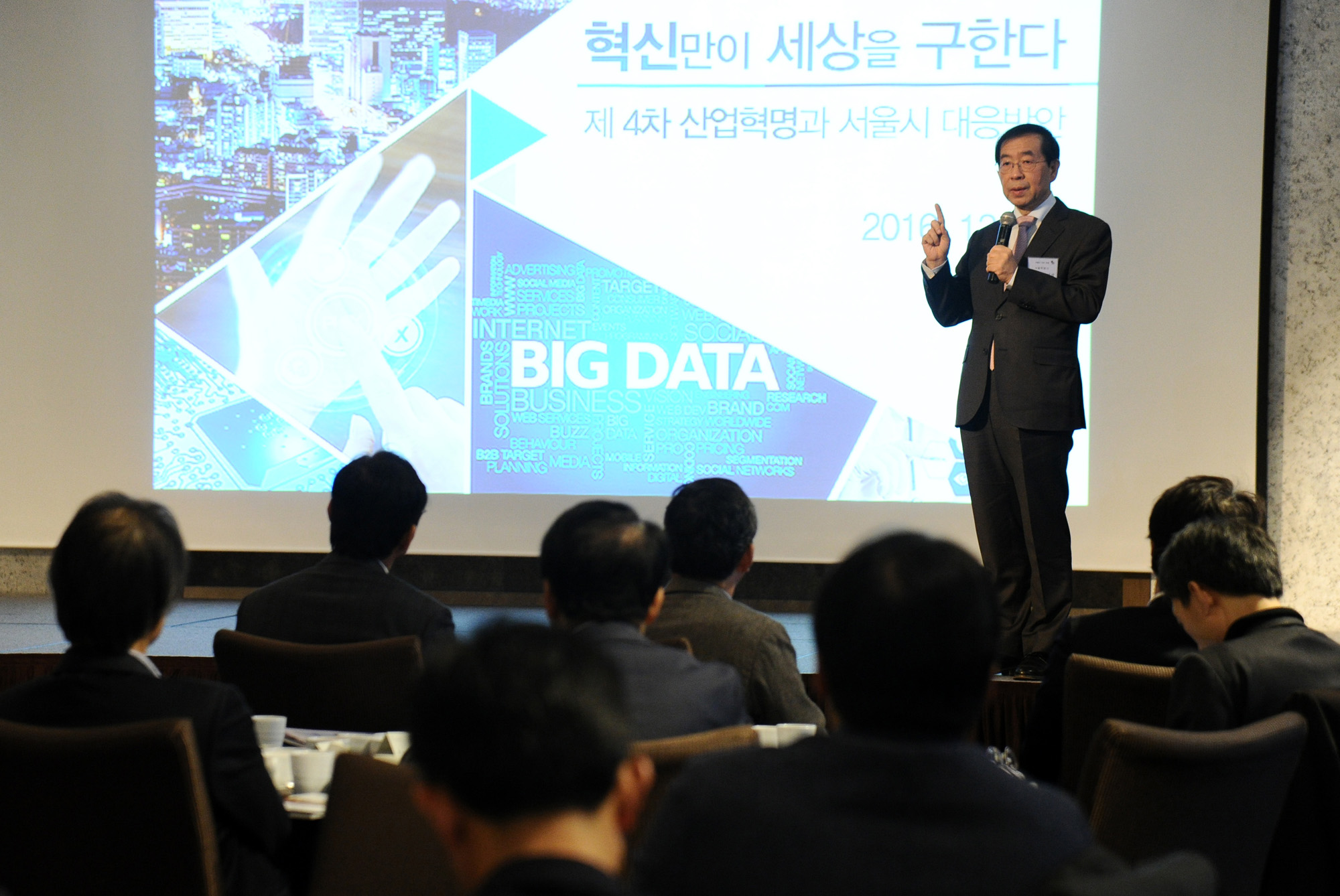 박원순 서울시장이 20일 오전 서울 구로구 쉐라톤 디큐브시티 호텔에서 열린 G밸리 CEO포럼에서 '4차산업혁명과 대한민국 중소기업이 나아갈 길'이란 주제로 강연을 하고 있다. 서울시 제공
