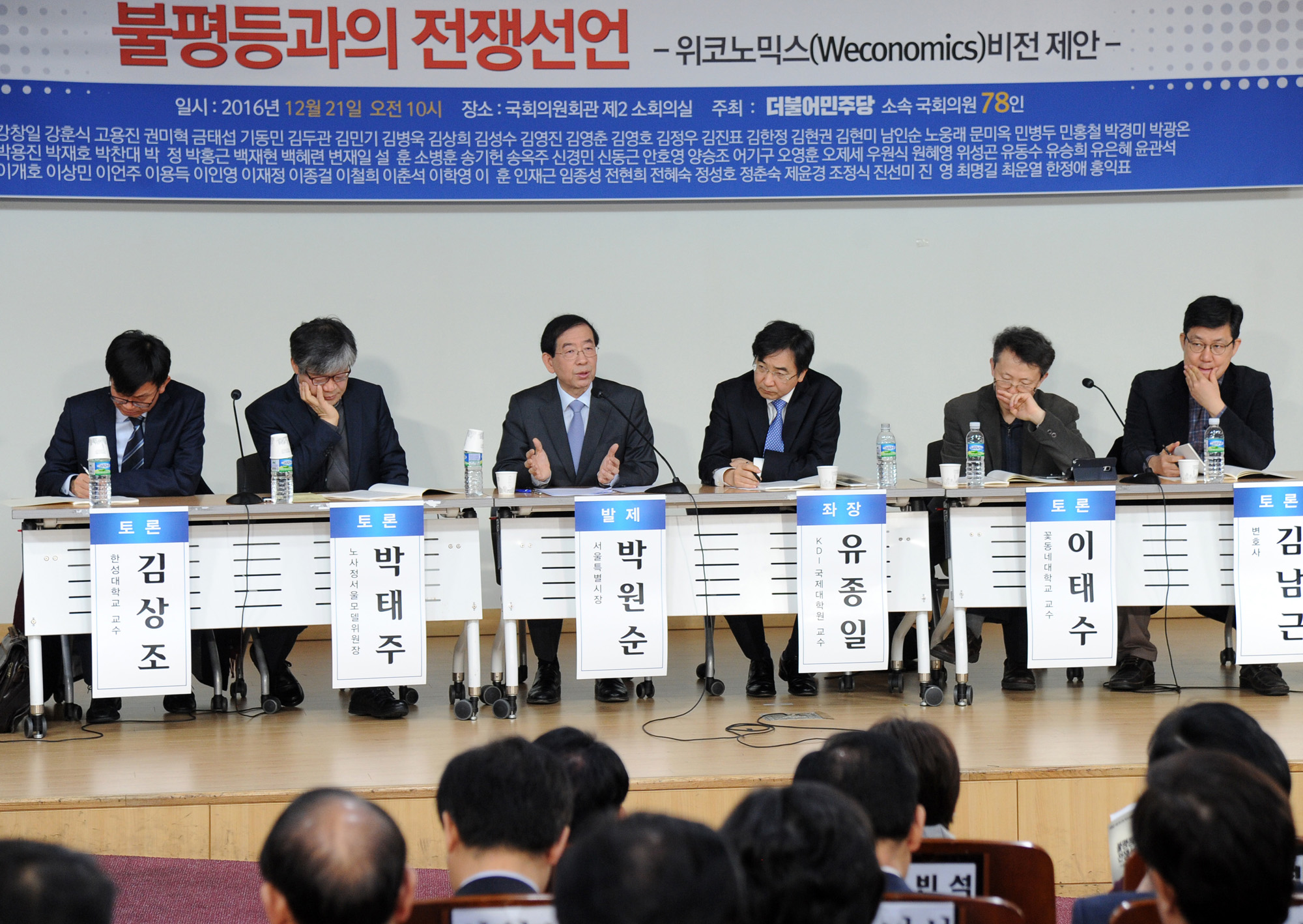 박원순 서울시장(가운데)이 21일 국회초청 토론회에서 발제를 발표하고 있다. 서울시 제공