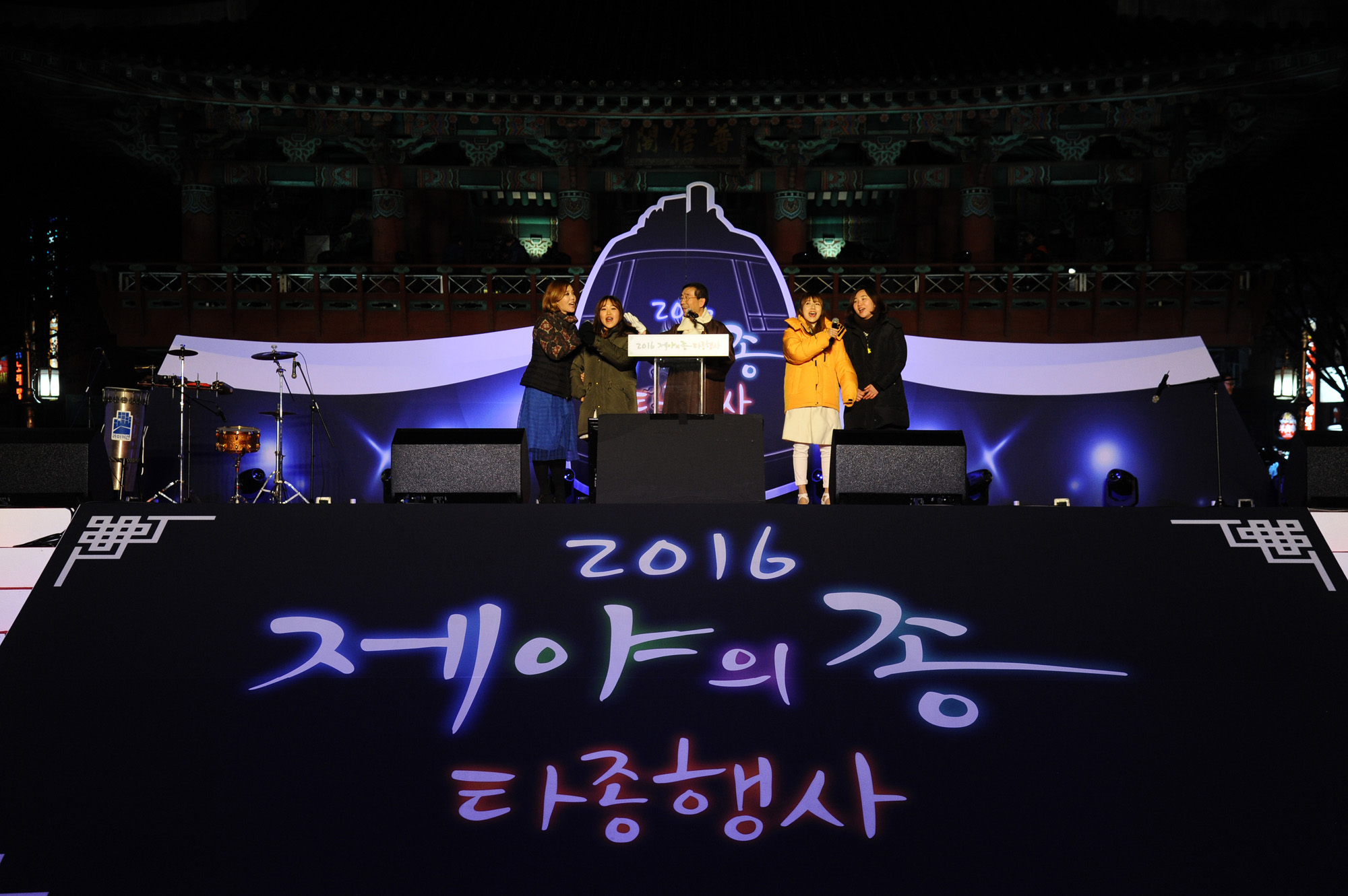 1일 서울 종로구 보신각에서 열린 2016 제야의 종 타종행사에서 박원순 서울시장, 양준욱 서울시의장, 일본군 위안부 피해자 길원옥 할머니 등 참석자들이 타종을 하고 있다. 서울시 제공