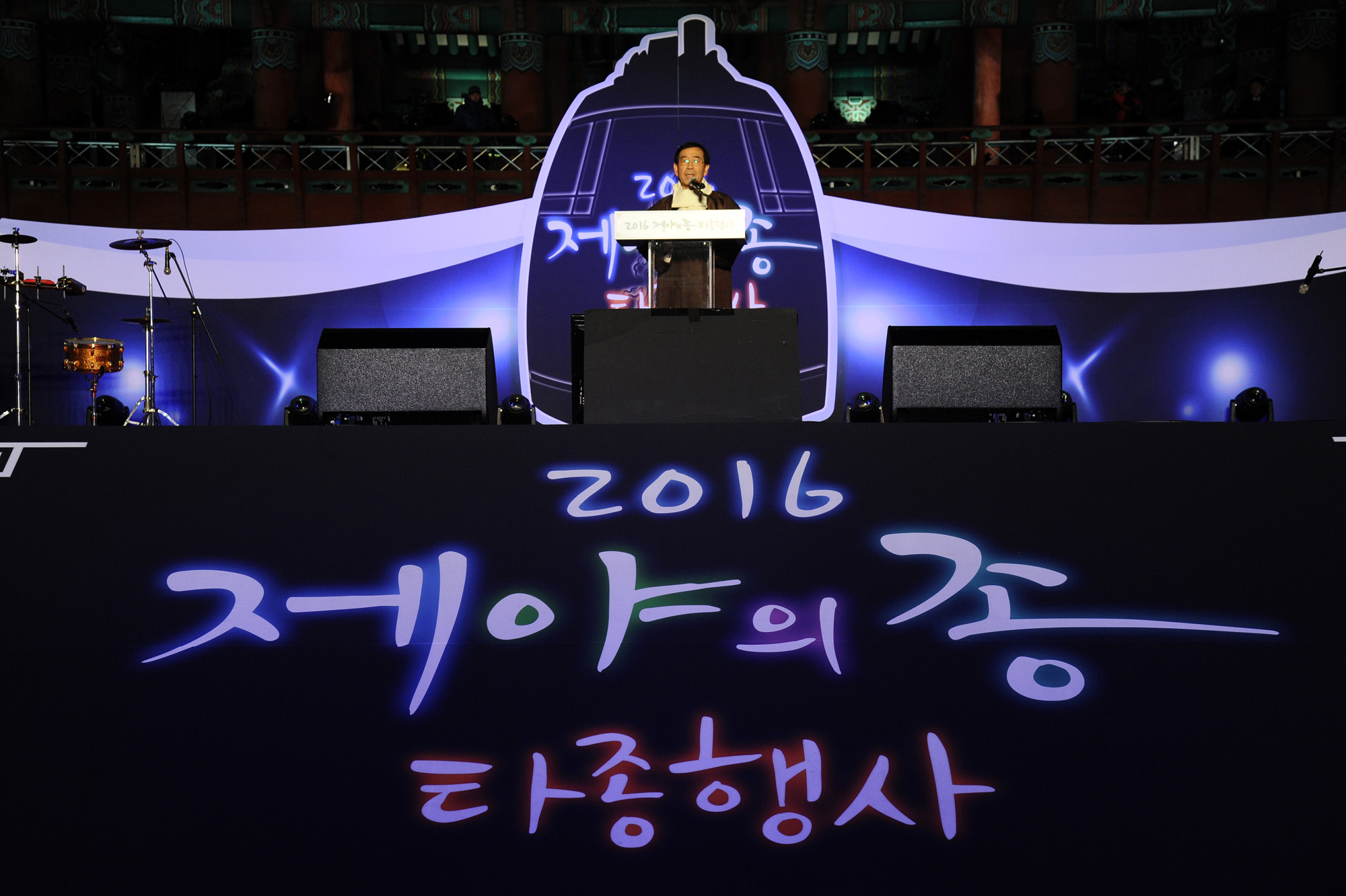 1일 서울 종로구 보신각에서 열린 2016 제야의 종 타종행사에서 박원순 서울시장, 양준욱 서울시의장, 일본군 위안부 피해자 길원옥 할머니 등 참석자들이 타종을 하고 있다. 서울시 제공